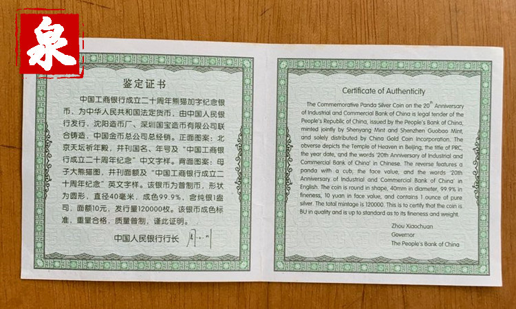 В 2004 году отмечают 20 -летие основания промышленного и коммерческого банка Китая, Panda 1 унция серебряных монет с сертификатом