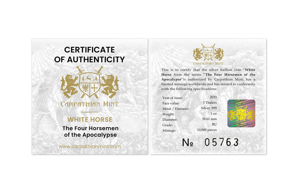 2314 = Карба 4 2023 Апокалипсис Четыре рыцаря -дех -белая лошадь 1 унция 999 Серебряная монета