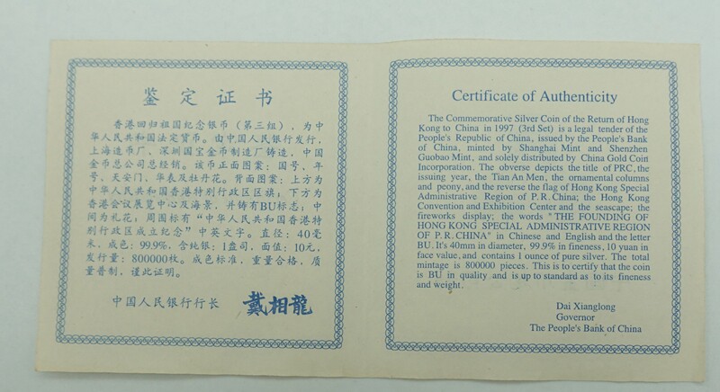 Памятная серебряная монета, 1997 года, Гонконг