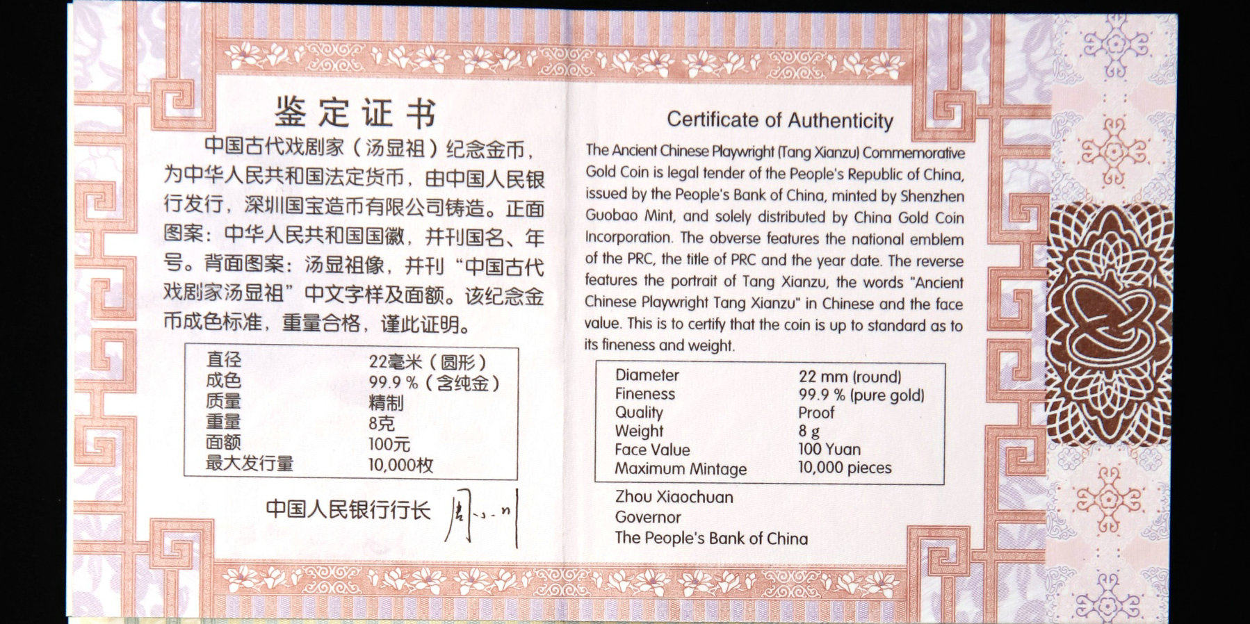В 2016 году 8 граммов древней китайской драмы (Тан Сянзу) Золотая монета 100 Юань с сертификатом AU999 Pure Gold 24K
