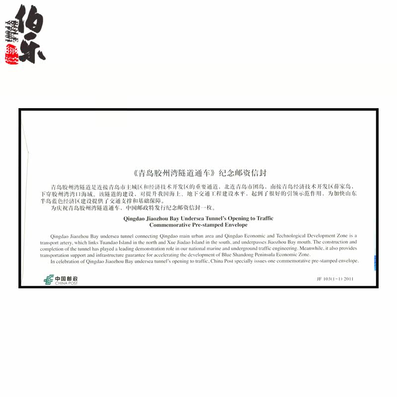 China Post планируется выпустить 1 набор «Qingdao Jiazhou Bay Tunnel» 30 июня 2011 года, чтобы отметить 1 комплект почтовых конвертов.Детали следующие: