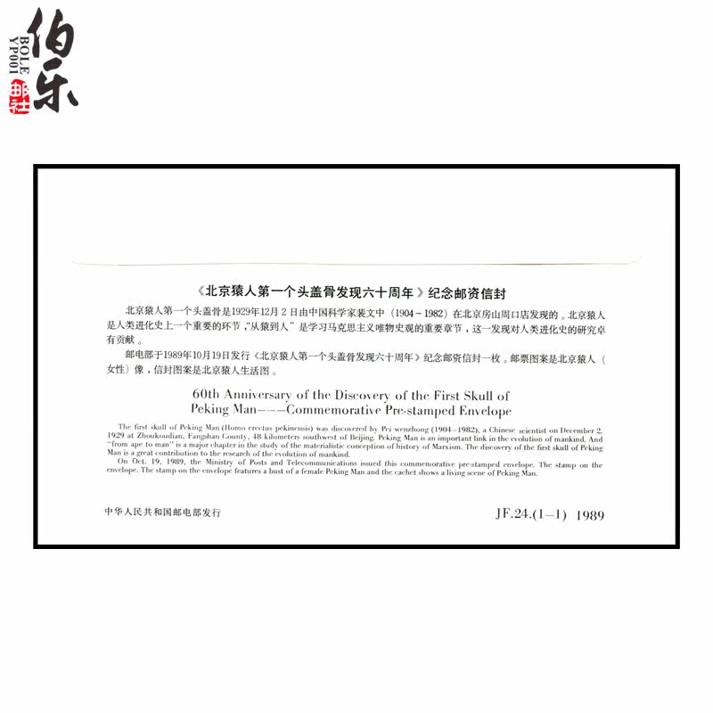 1989 год был 60 -летием первого открытия черепа Пекинского обезьянного человека. С 19 по 24 октября моя страна провела международный древний академический семинар в Пекине, чтобы ознаменовать это крупное открытие.Первый череп Пекинского обезьянного человека был обнаружен китайским ученым Пей Вэньчжонгом 2 декабря 1929 года на горе Кил в Чжоукоу, Фаншан, Пекин.Пекин -обезьяна -мужчина является важной частью истории эволюции человека. Его открытие является важным вкладом в мою страну в академический вклад и имеет большое значение для изучения истории человеческого развития.Министерство должностей и телекоммуникаций выпустило памятные почтовые расходы, запечатанные почтовыми расходами.Закупорка -это картина жизни Пекинского обезьяна, изображающей цвет китайской линии живописи.