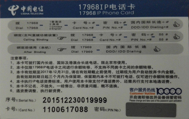 Карта 17968/9 может использоваться на мобильном телефоне Пекин (кроме Unicom Ruyitong и Ruyi133) и стационарной линии (недоступна в Xioalingtong).После привязки номер карты и пароль не набираются, и для обеих использования используется одна карта.