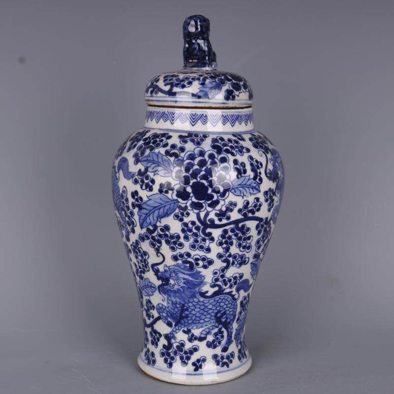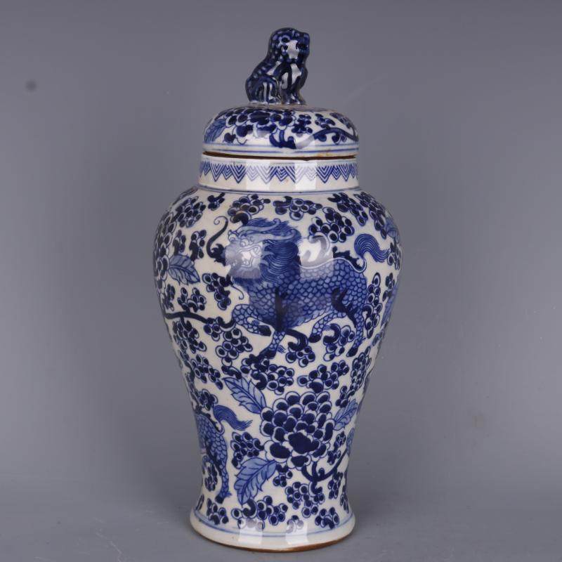 Цин Канси сине -белые цветы в цветочном одноразовом рисунок банка льва