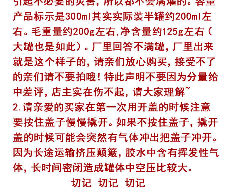 Получив товар, многие родственники реагируют на клей только для половины банки.Если его легко протекать или расширяться во время транспортировки, он не будет заполнен ненужными бедствиями.Метка продукта емкости составляет 300 мл.Вес волос составляет около 200 г, а чистый контент составляет около 125 г.(То же самое относится и к большим банкам).Фабрика ответила на неудовлетворенность, и завод вышел так.Настоящим я заявляю, что не дает плохой отзыв из -за веса