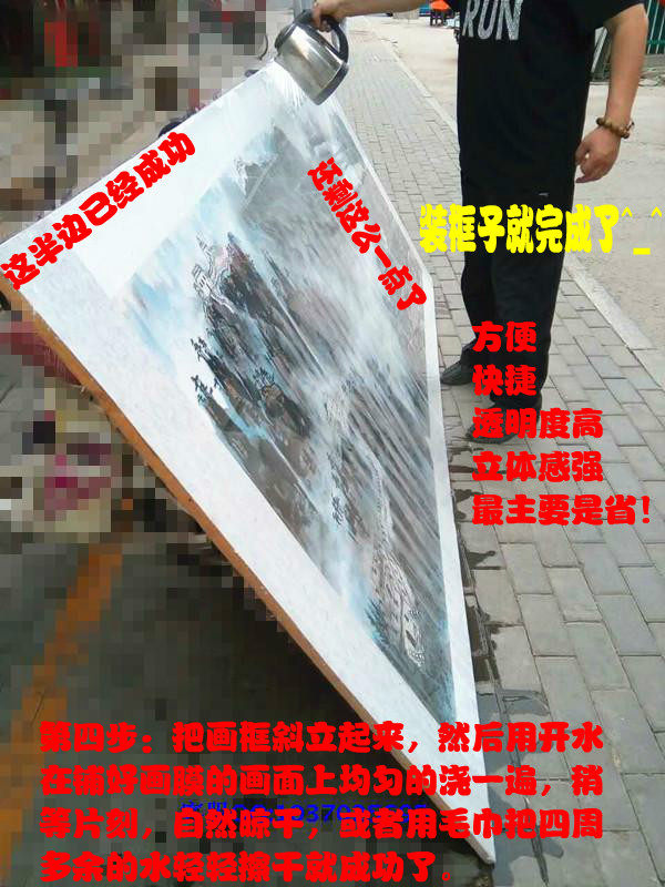 три:Фильм фиксируется на скелете рамы,Вылейте его кипящей водой. Этот метод является самым быстрым. Он может быть зафиксирован на скелете рамы. Это не имеет значения, когда у вас нет предварительного нагрева. Предварительное сокращение плотное. Он очень адсорбируется на картине, защищает картину и Добавляет яркую куртку к картине. Прозрачность очень высока, а трехмерный смысл особенно силен.Не толстая пленка.