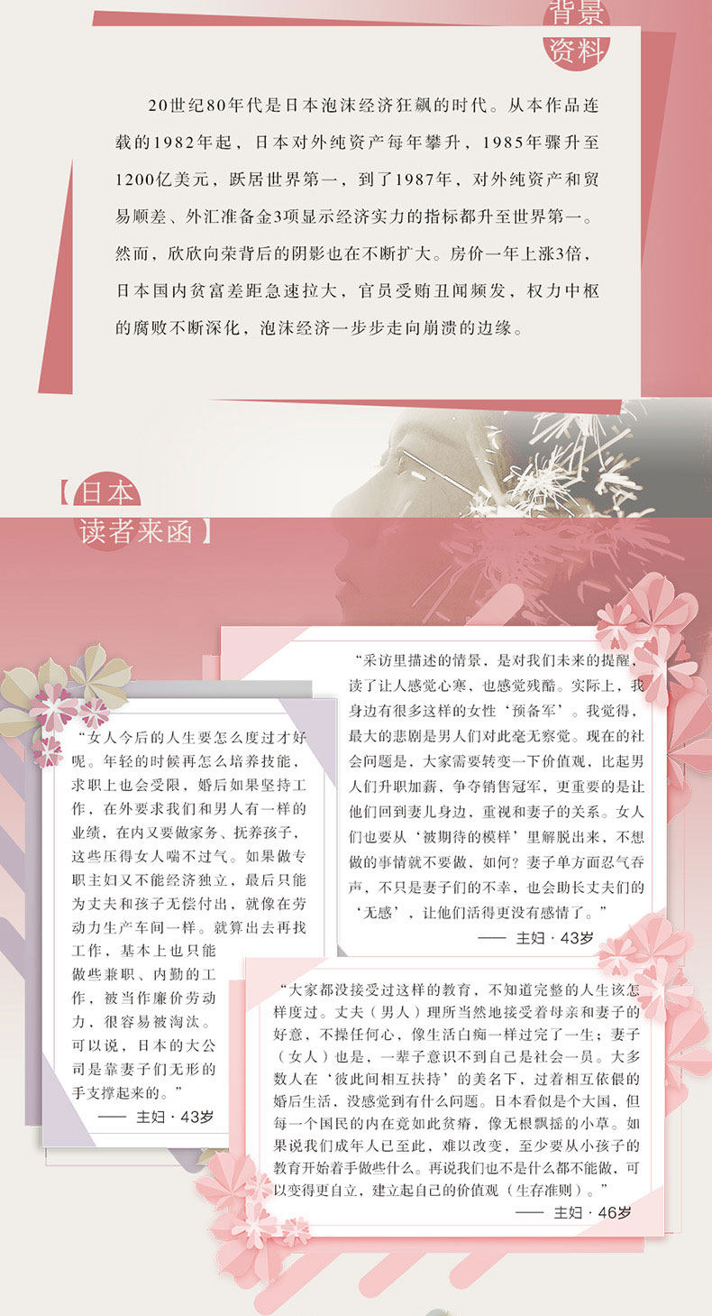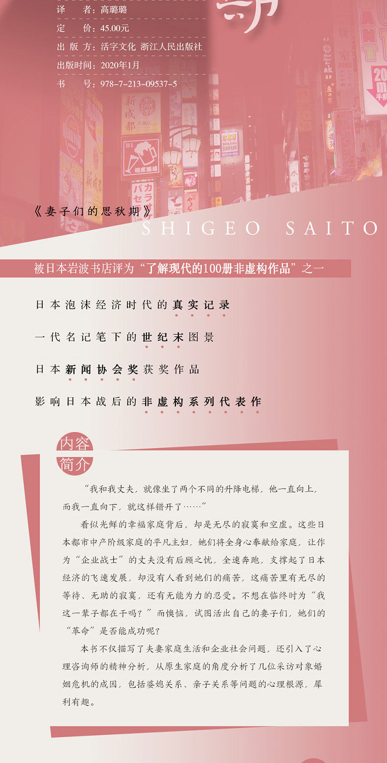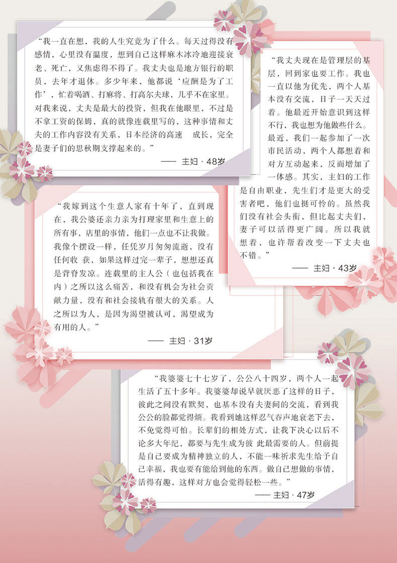 “ я и мой муж, как сидеть на двух разных лифтах, он продолжал подниматься, и я продолжал спускаться, так что ошеломленный……&Rdquo; за казалось, славной счастливой семьей - это бесконечное одиночество и пустота.Обычные домохозяйки этих семей со средним классом в Японии, они посвятят себя своим семьям и позволят своим&Ldquo; корпоративный воин&Ее муж не заботился о своих заботах, бегал на полной скорости, поддерживая быстрое развитие японской экономики, но никто не видел их боли. У этой боли было бесконечное ожидание, беспомощное одиночество и бессильную терпимость.Не хочу делать это в конце жизни“ почему я делаю это в своей жизни?” раздражает, пытаясь прожить своих жен, их&Ldquo; революция&Rdquo; может ли это добиться успеха?Эта книга не только описывает жизнь и социальные проблемы семьи мужа и жены, но также вводит психоанализ психологических консультантов. С точки зрения местных семей, причины кризиса брака нескольких объектов интервью, включая психологические корни отношений Между матерью -в -лаком и родительскими отношениями, острыми и интересными.
