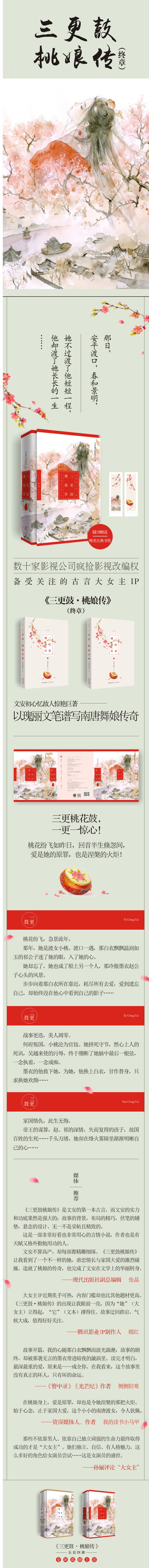 [《三更鼓]&[middot;桃娘传》延续了文安一贯跌宕曲折的情节设置,只是格局更大,骨*更饱满,举重若轻地将一个出身卑微却为爱奋不顾身的南唐平凡渡女,在情爱的坎坷与多舛的命运中慢慢找到真正的生命意义,时势、家国、与对爱人的挚爱,将其一步步,推至人生乃至历史的*之位。]