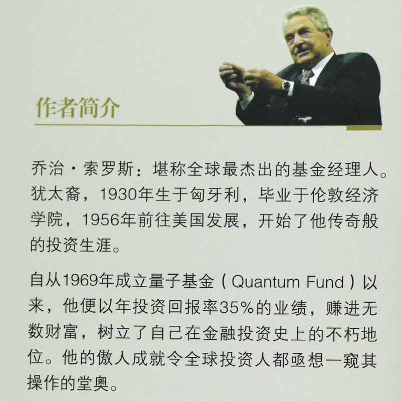В настоящее время он является глобальным и прибыльным инвестором."Коммерческий еженедельный" уважал его“ сожалеет о людях на рынке”.Однажды он взял фунт и заработал миллиарды долларов, и даже некоторые люди сказали, что он спас англичан и оставил его от экономического спада.Сорос - не только финансовый, но и мыслитель.Он славится своей острой интуицией в финансовой сфере, и многие из его работ -лучшие книги, в том числе «финансовые нефтепрограммы» и «Сорос, разговаривая со Соросом».