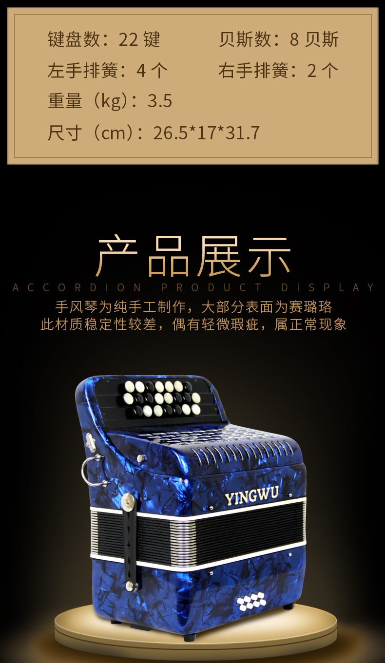 ОригиналТяньцзиньОснованная в 1952 году, фабрика музыкальных инструментов является самым ранним производителем инструментов, занимавшимся производством Qinqin в моей стране. После более чем 50 -летнего развития и роста компании стали крупнейшими внутренними производителями в масштабах внутренних производств."попугай"В стране продается более 45 000 карт, которые продаются в стране и более 70 странах и регионах страны. Годовые продажи более 70 миллионов юаней, экспорт иностранной валюты в течение почти 2,5 миллионов долларов США, а также производство и продажи заняли первое место в той же отрасли страны.1979"попугай"Brand 120 Bass Four -Row Spring Hand -Permade Piano получила награду Silver Award в национальной активности по оценке качества светоигрыш. В 1984 году продукт снова выиграл Golden Award."золотой дракон"приз."попугай"Пианино бренда стал рекомендуемым продуктом Ассоциации музыкальных инструментов Китая.Ключевые кнопки и бесплатный басовый аккордеон, разработанный в разработке и разработке компании, начали формироваться и развиваться в направлении серии. Бесплатный басовый аккордеон имеет два зрелых продукта, а именно: 106K 120b Двойная система преобразования кнопка Двойная система 46K120B может преобразовать аккордеон типа клавиатуры, а его производственные мощности могут достигать 10-15 единиц в год, а цена составляет около 30 000 юаней, что может удовлетворить особые потребности профессионалов.