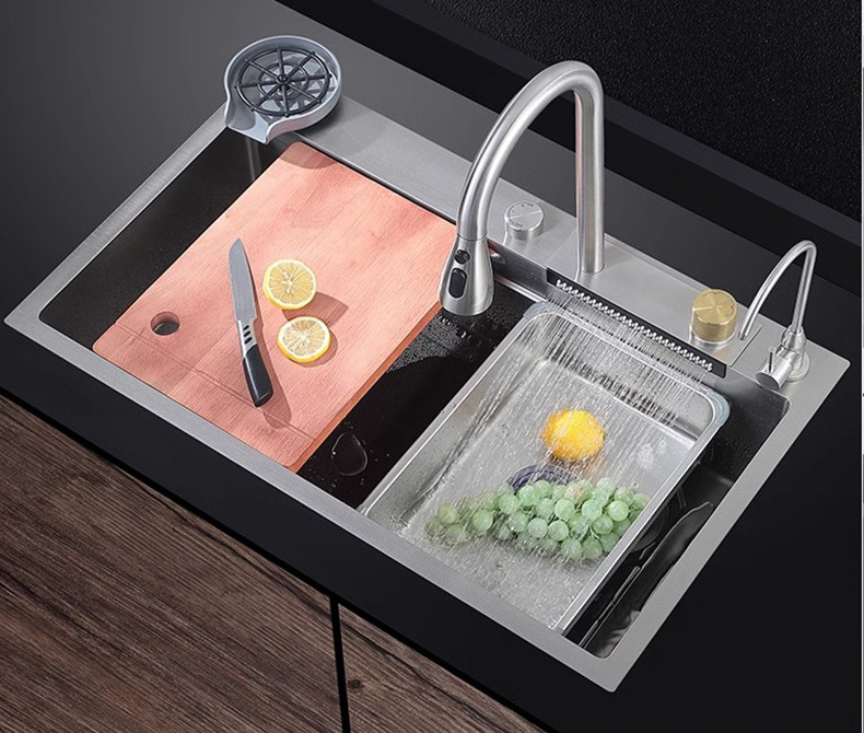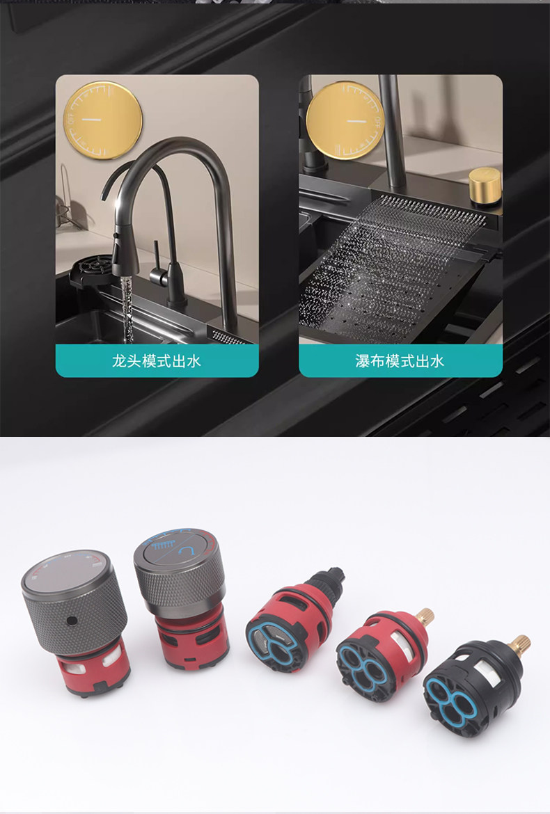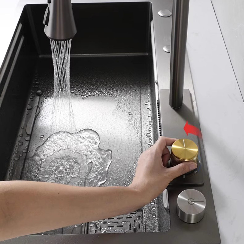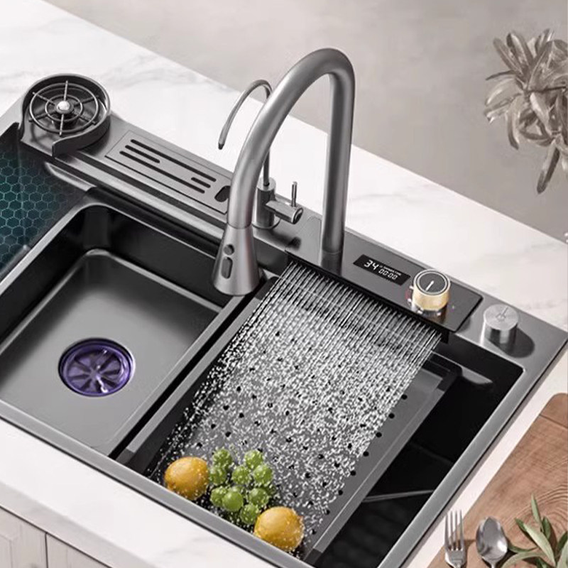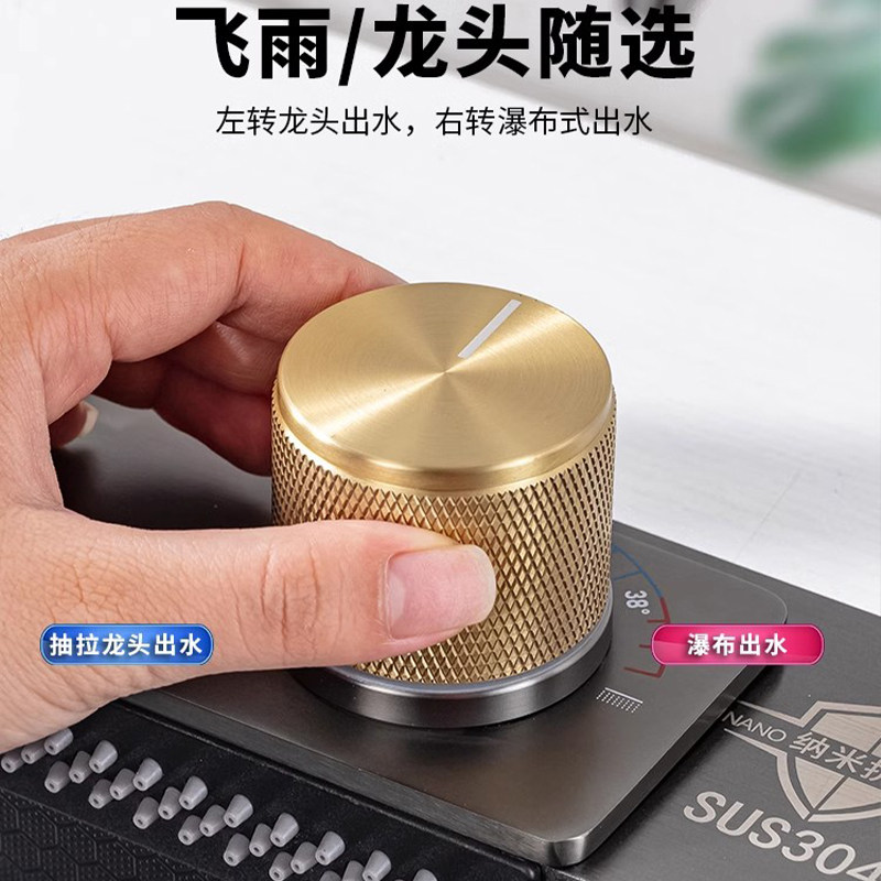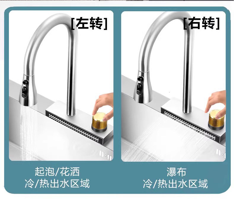 Кухонная раковина, раковина для посуды, водопадный смеситель с дождевой водой, разделение воды и регулировка температуры, встроенный клапан, керамическая ручка, смешанная горячая и холодная вода вкл. 𫔭 выкл.