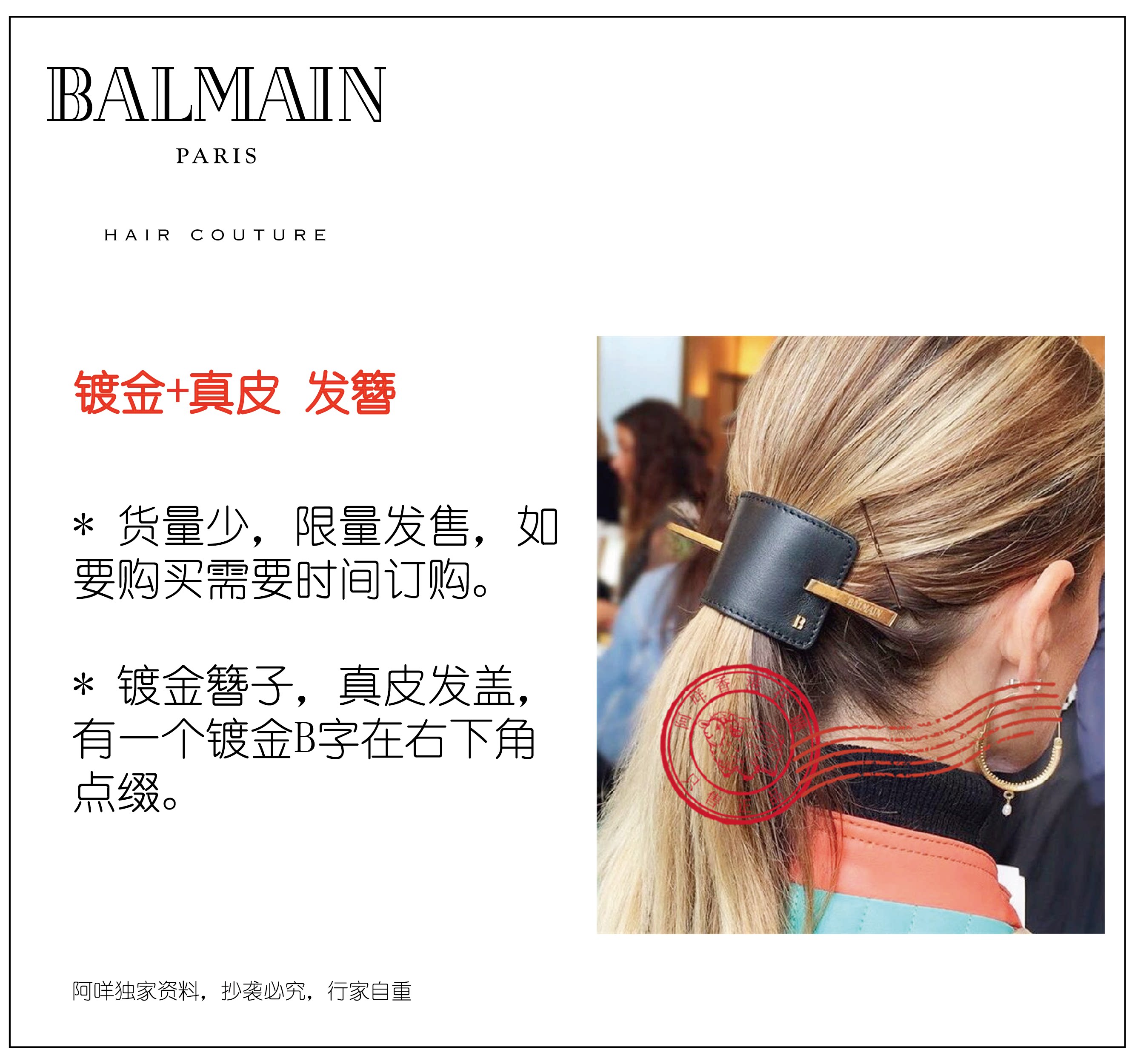 Необходимо заказать бесплатную доставку SF Express на французских волосах Balmain, кожаная позолоченная шпилька модная маленькая женственная