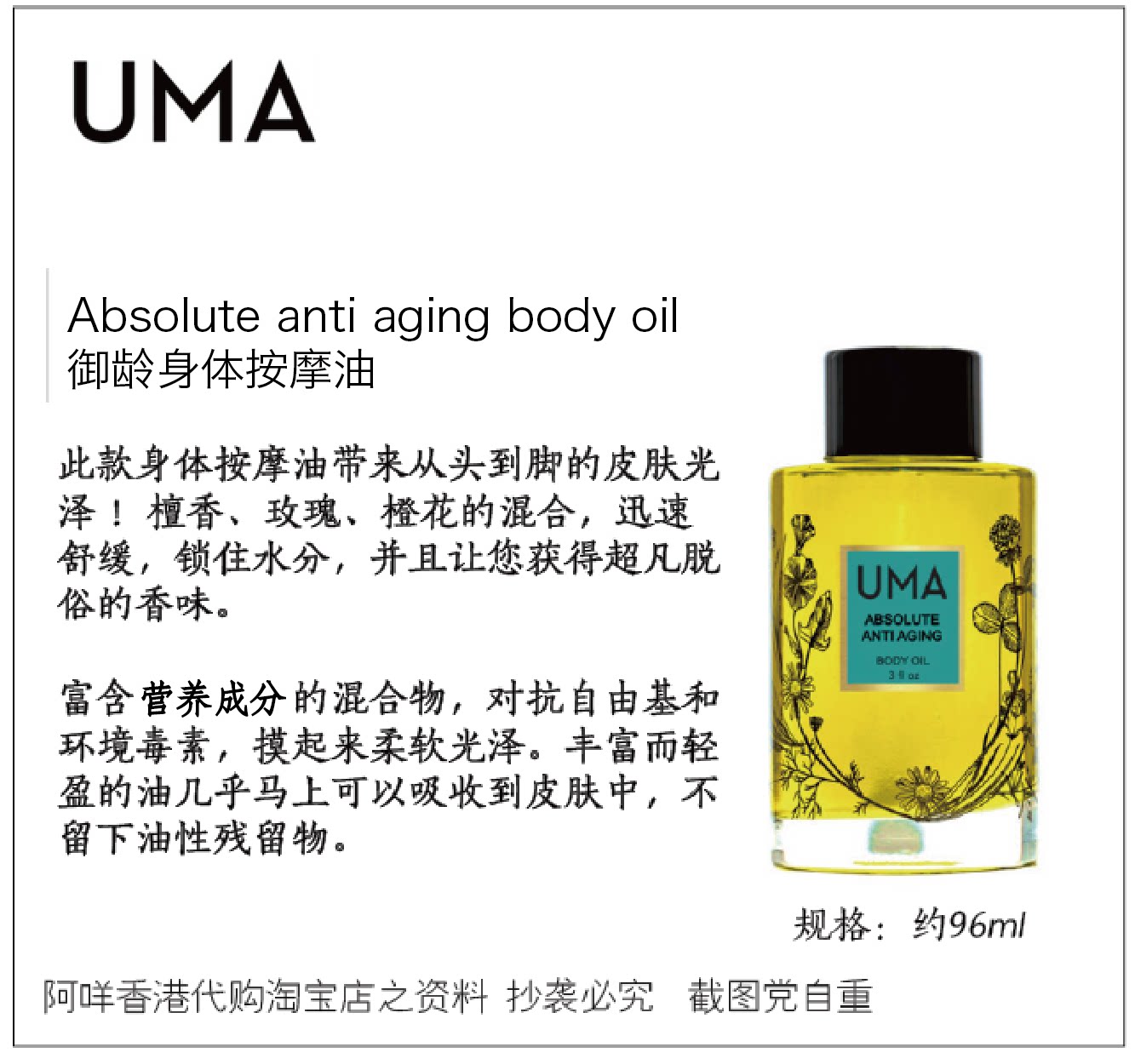 Средство для закупок нишевого ухода за древней кожей UMA стареющее массажное масло для тела 96 мл ABSOLUTE ANTI AGING