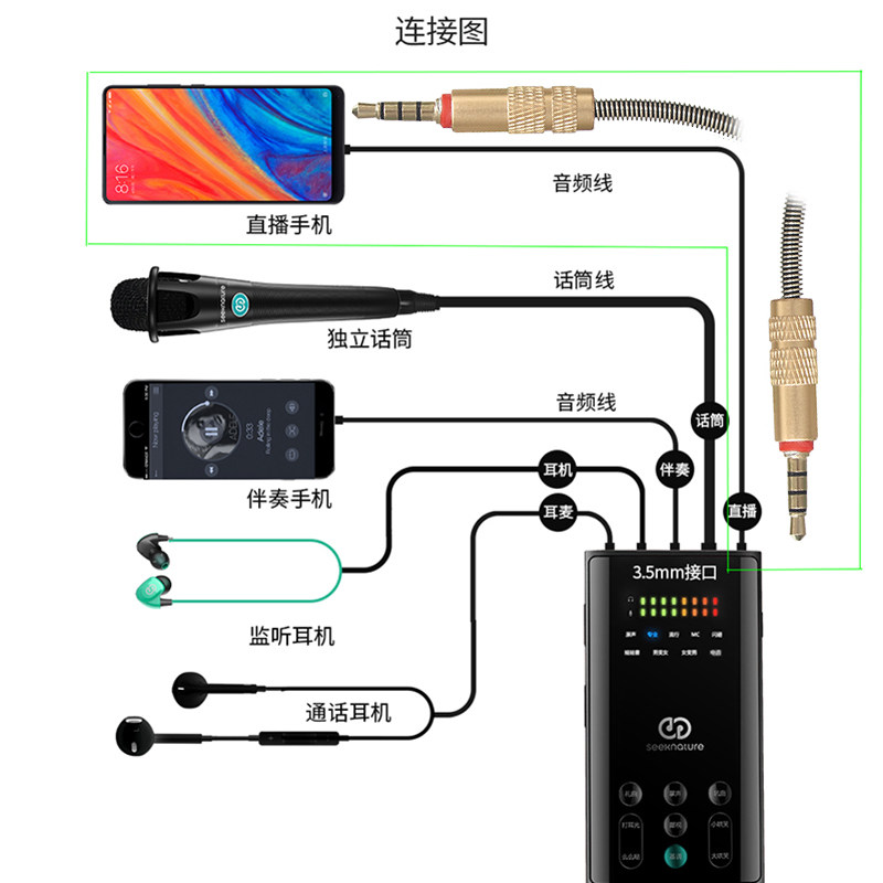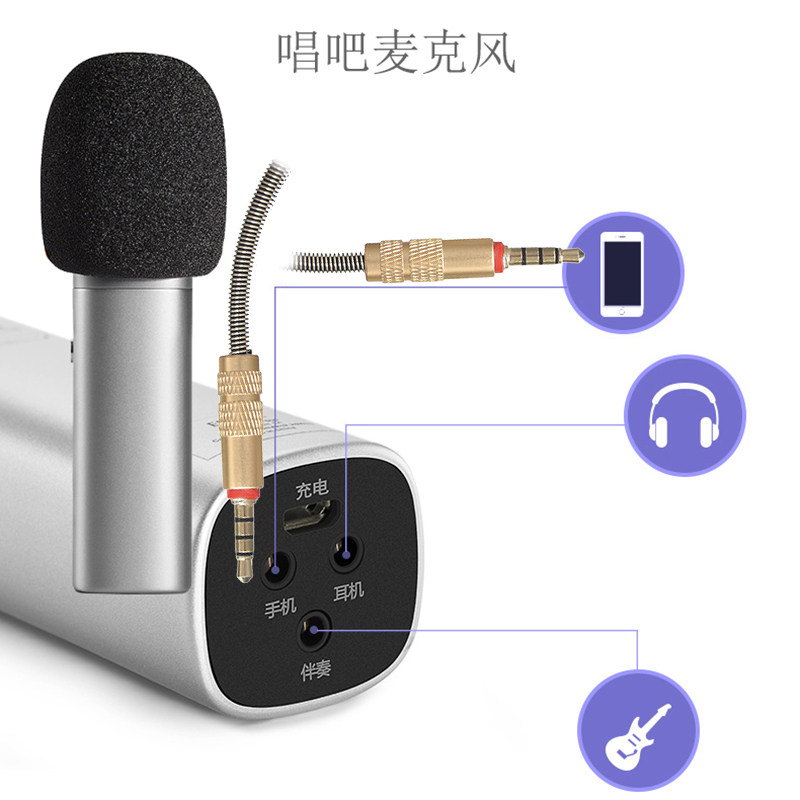 Использование:Используйте микрофон и аудиокарту для живой трансляции (небольшая часть поддерживает интерфейс Car Aux с 4 основными интерфейсами, как правило, слушайте песни, выберите 3 основных интерфейса)