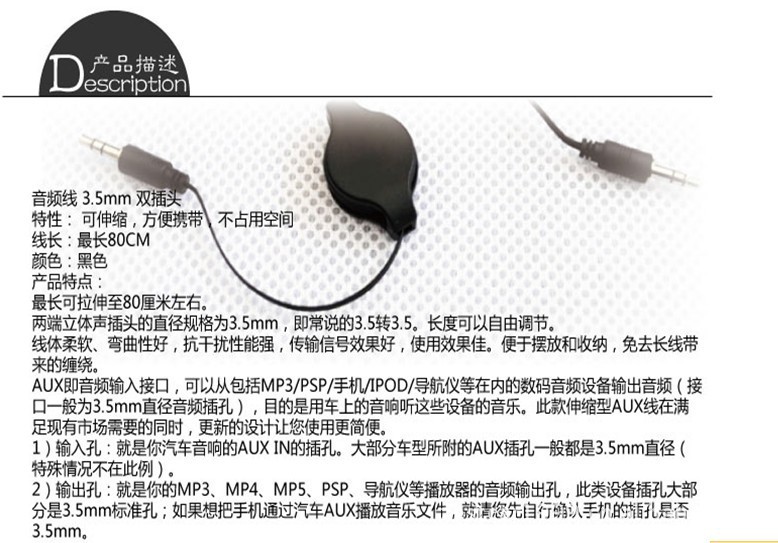 Aux - это аудио входной интерфейс, который может выводить звук цифровых аудиоустройств, включая MP3/PSP/Mobile/iPod/Navigator (интерфейс, как правило, является аудиораздела диаметра 3,5 мм). Музыка.В то же время, когда эта телескопическая линия Aux отвечает потребностям существующего рынка, обновленный дизайн позволяет вам использовать его больше?