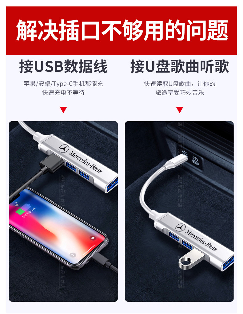 Подходит для Mercedes -Benz Car Mobile Phone Зарядка USB Rotor E300L/GLC Converter A200L Кабель данных GLB