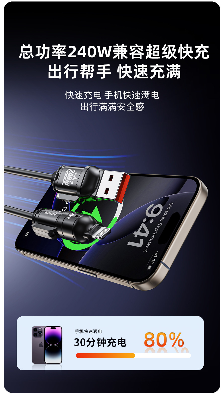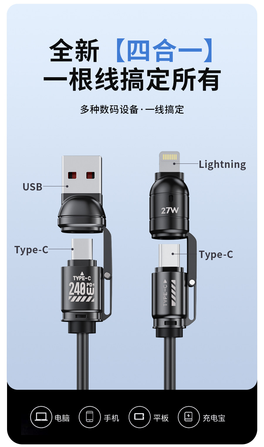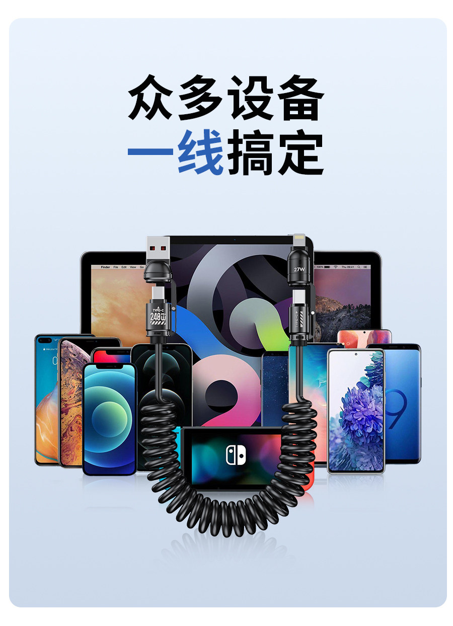 240 Вт пружинный кабель для быстрой зарядки «четыре в одном», подходит для Huawei Android Apple 17/16/15 проекционный экран carplay