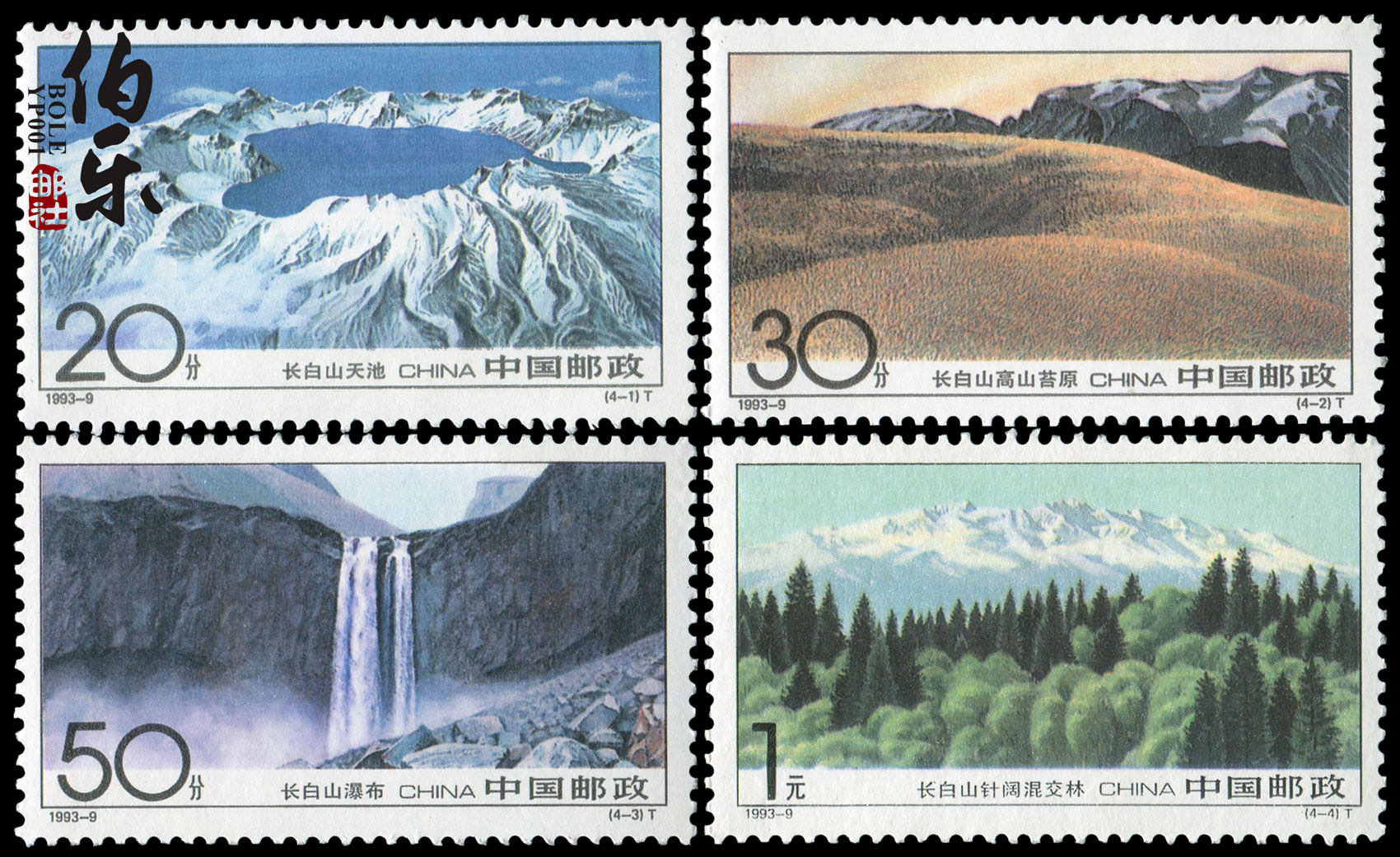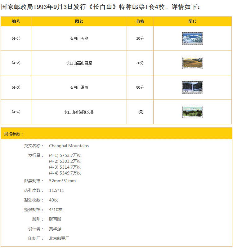 Гора Чанбайшань расположена на границе между Китаем и Северной Кореей в уезде Аньту Яньбяньского корейского автономного округа, восточной провинции Цзилинь.Он богат природными ресурсами, имеет красивые и величественные пейзажи и имеет чрезвычайно высокую научную и природоохранную ценность.По этой причине в 1960 году народное правительство провинции Цзилинь решило создать природный заповедник горы Чанбайшань.Четыре изображения в этом наборе марок относительно полно отражают топографию, формы рельефа и распределение растительности горы Чанбайшань, показывают различные пейзажи на разных высотах горы и отражают величественный, величественный и торжественный вид этой знаменитой северной горы.