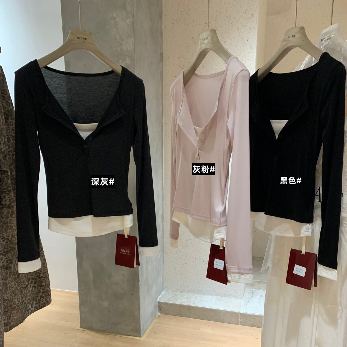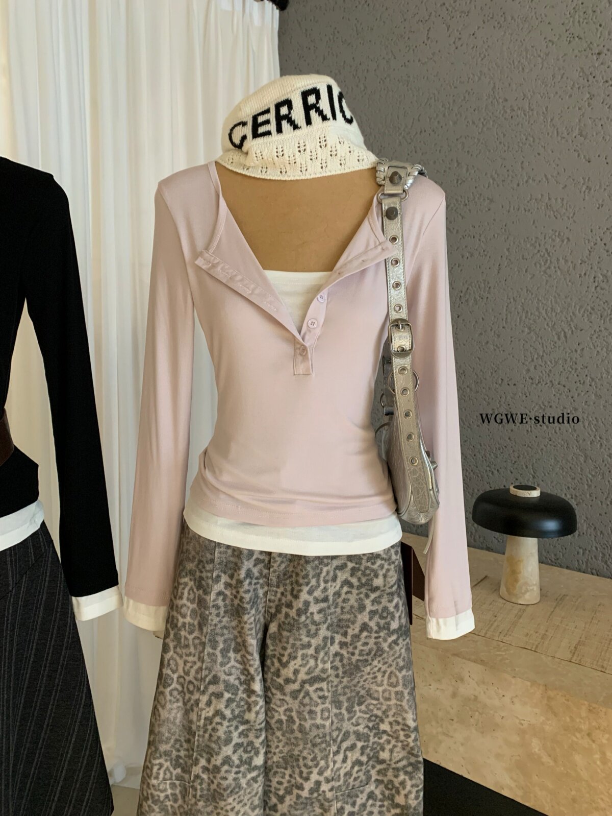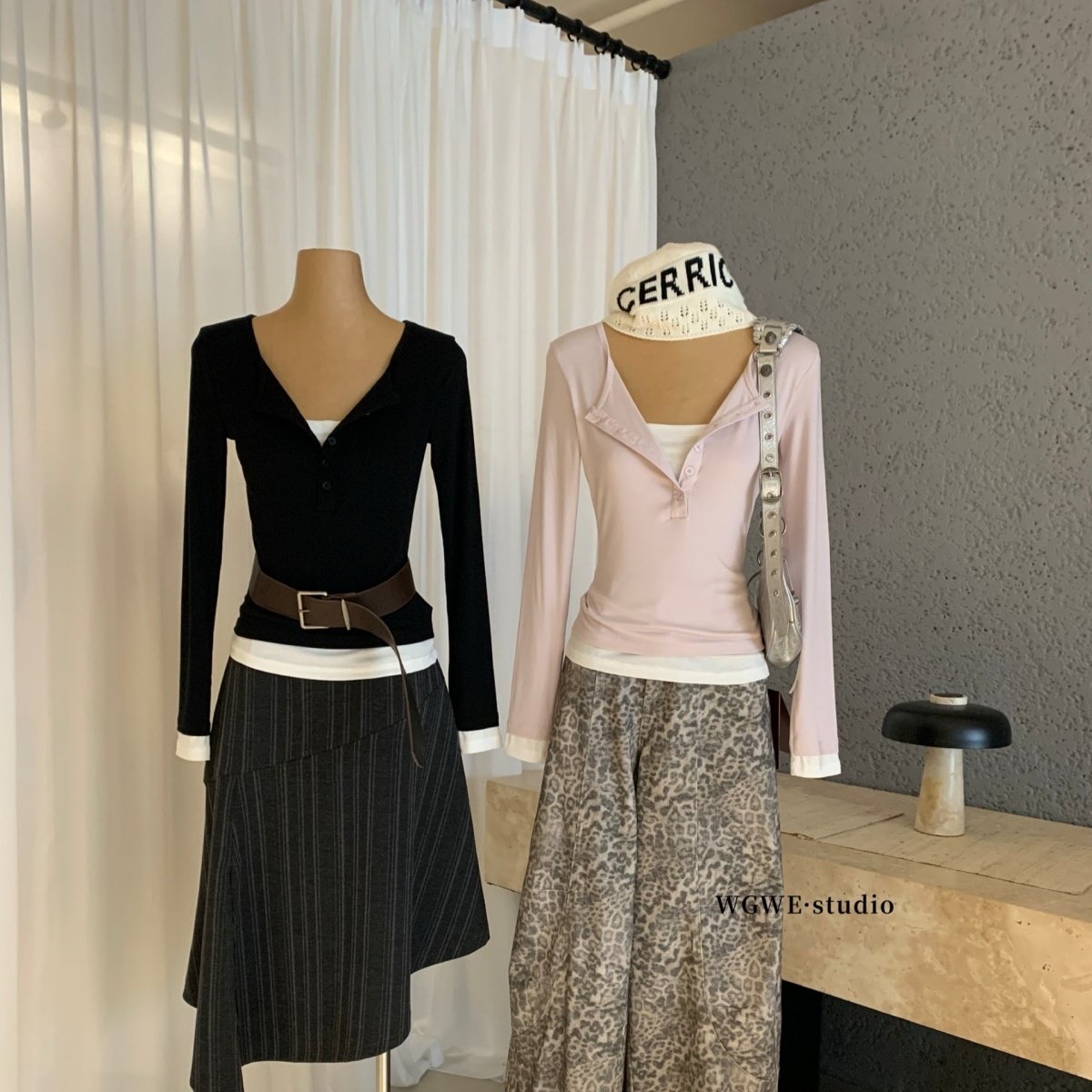 WGWE2025 осенне-зимняя тонкая и универсальная женская футболка с длинными рукавами в стиле ретро с полуоткрытым V-образным вырезом и пуговицами контрастного цвета.