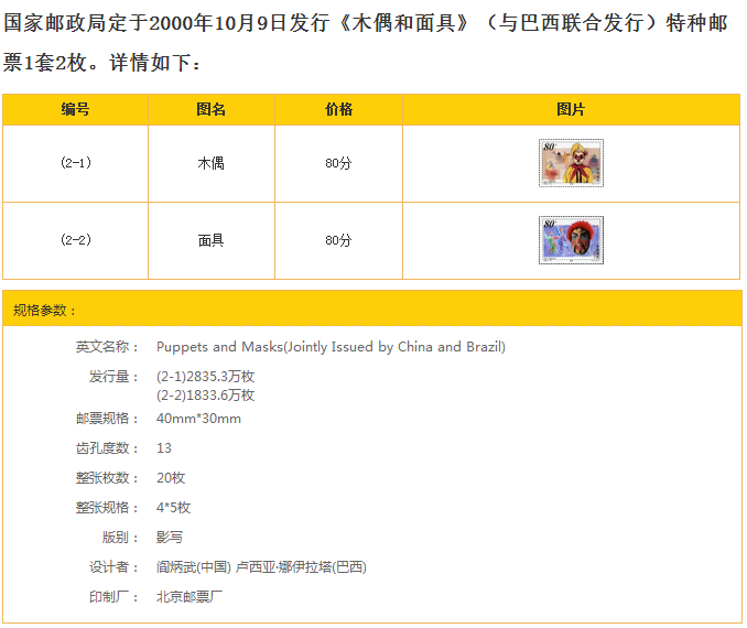 Куклы и маски являются традиционным китайским и бразильским народным искусством соответственно.Марионетки в Quanzhou, Fujian ярко окрашены, уникальны по форме, гибкие в эксплуатации и жизнь в производительности.Изображение Sun Wukong на марок происходит от классического китайского литературного шедевра «Путешествие на запад».Среди бразильцев великий карнавал, который длится несколько дней, проводится каждый год.Люди носят костюмы или маски, одеваются как мифы или древние фигуры, а также поют и танцуют на улицах.Карнавальные маски красочные, либо юмористические и преувеличенные, или серьезные или православные, и имеют сильную художественную привлекательность.Этот набор марок был выпущен совместно почтовой службой Китая и Бразилии.