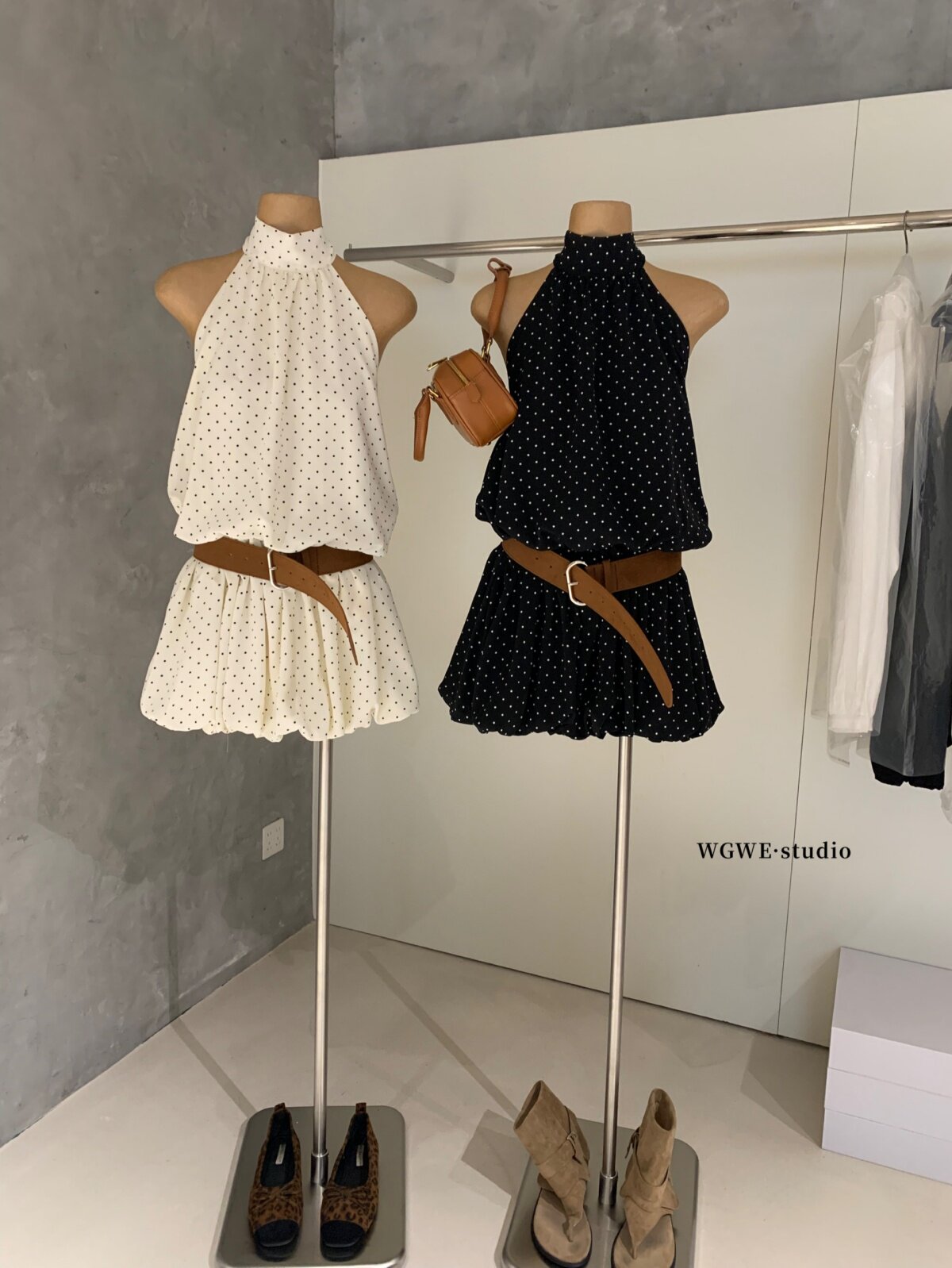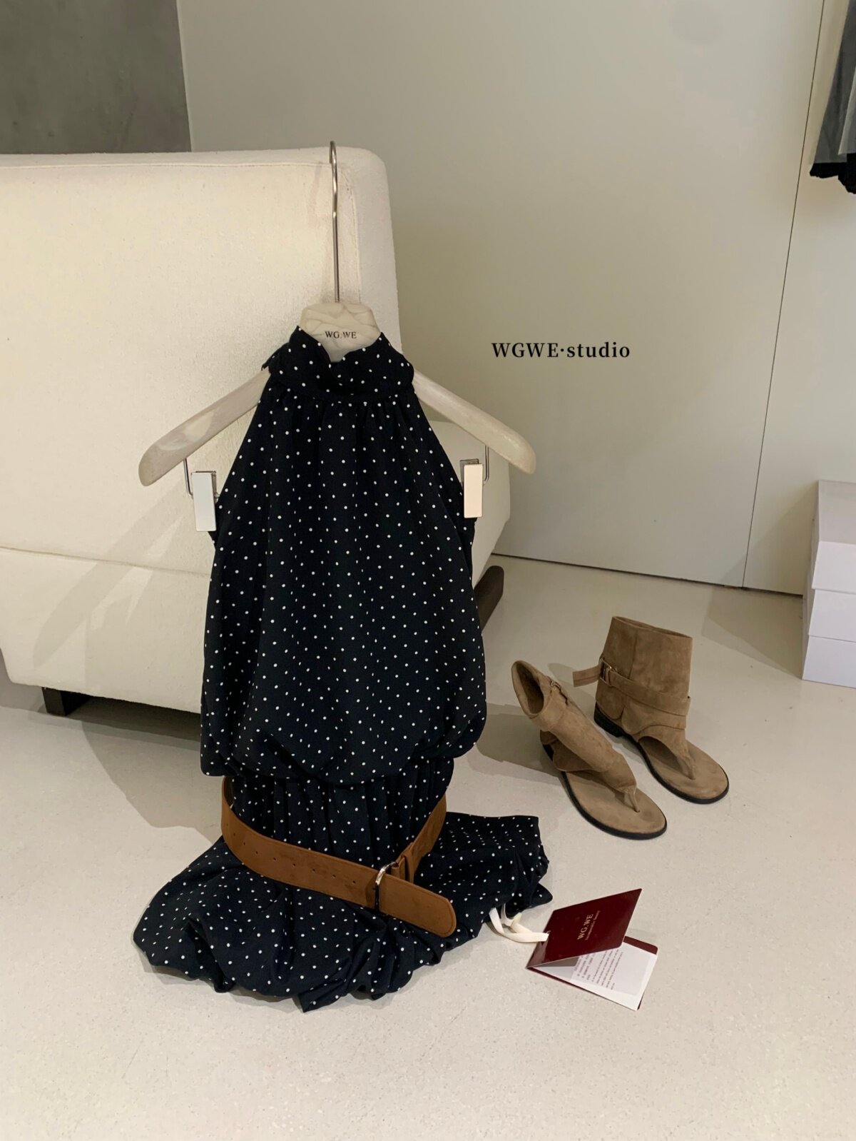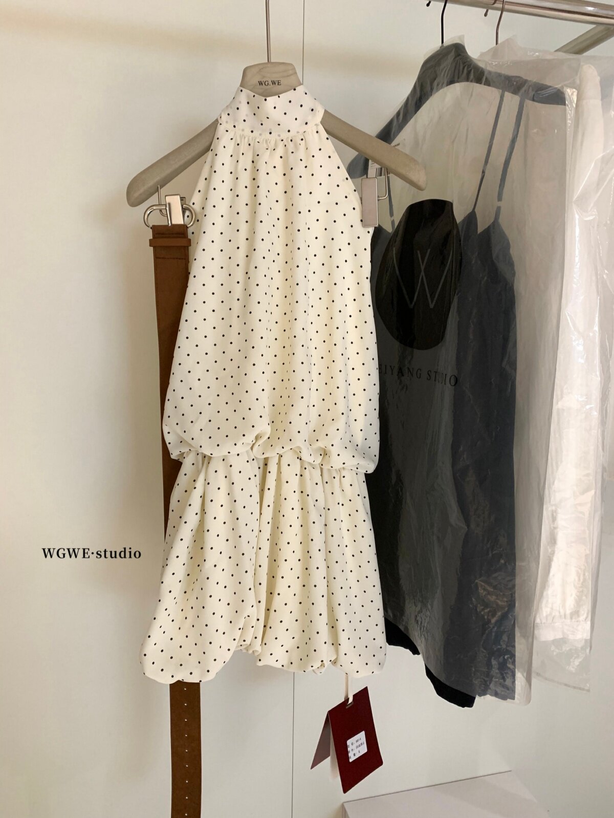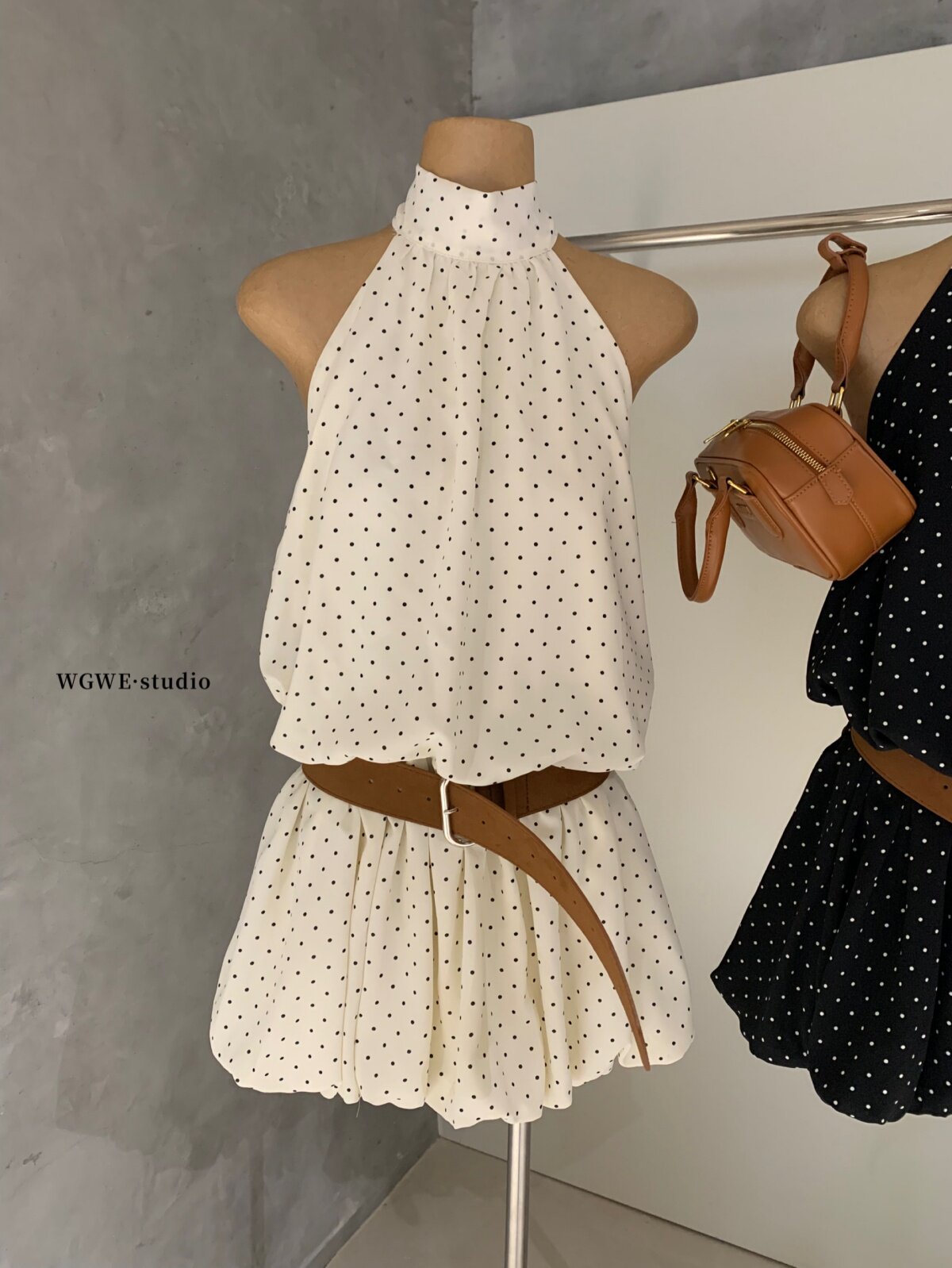 WGWE2026 весенне-летнее французское платье в горошек с подвесным воротником для женщин с возрастным темпераментом, короткая юбка А-силуэта с модным поясом