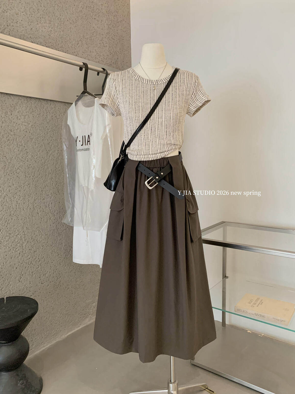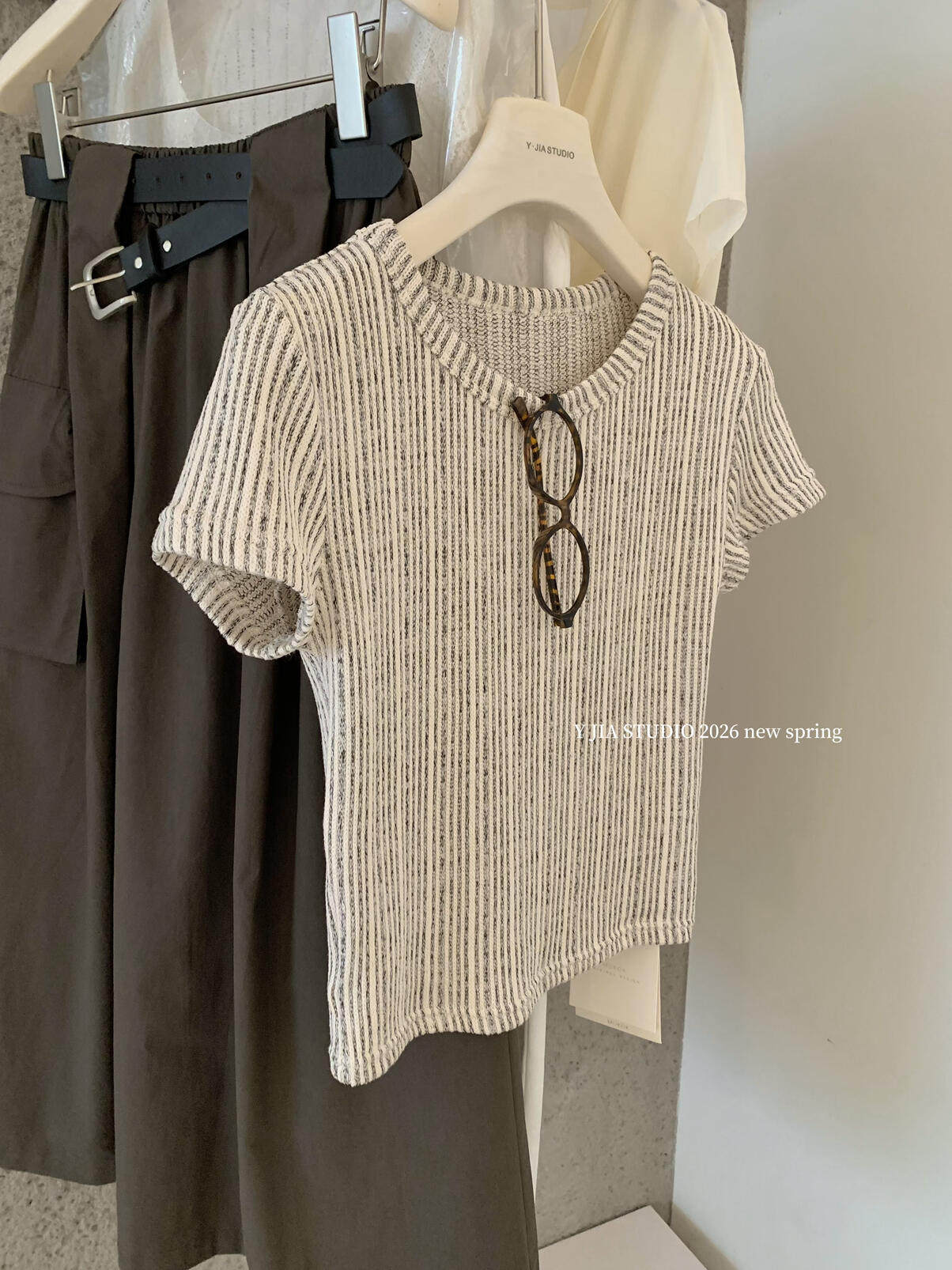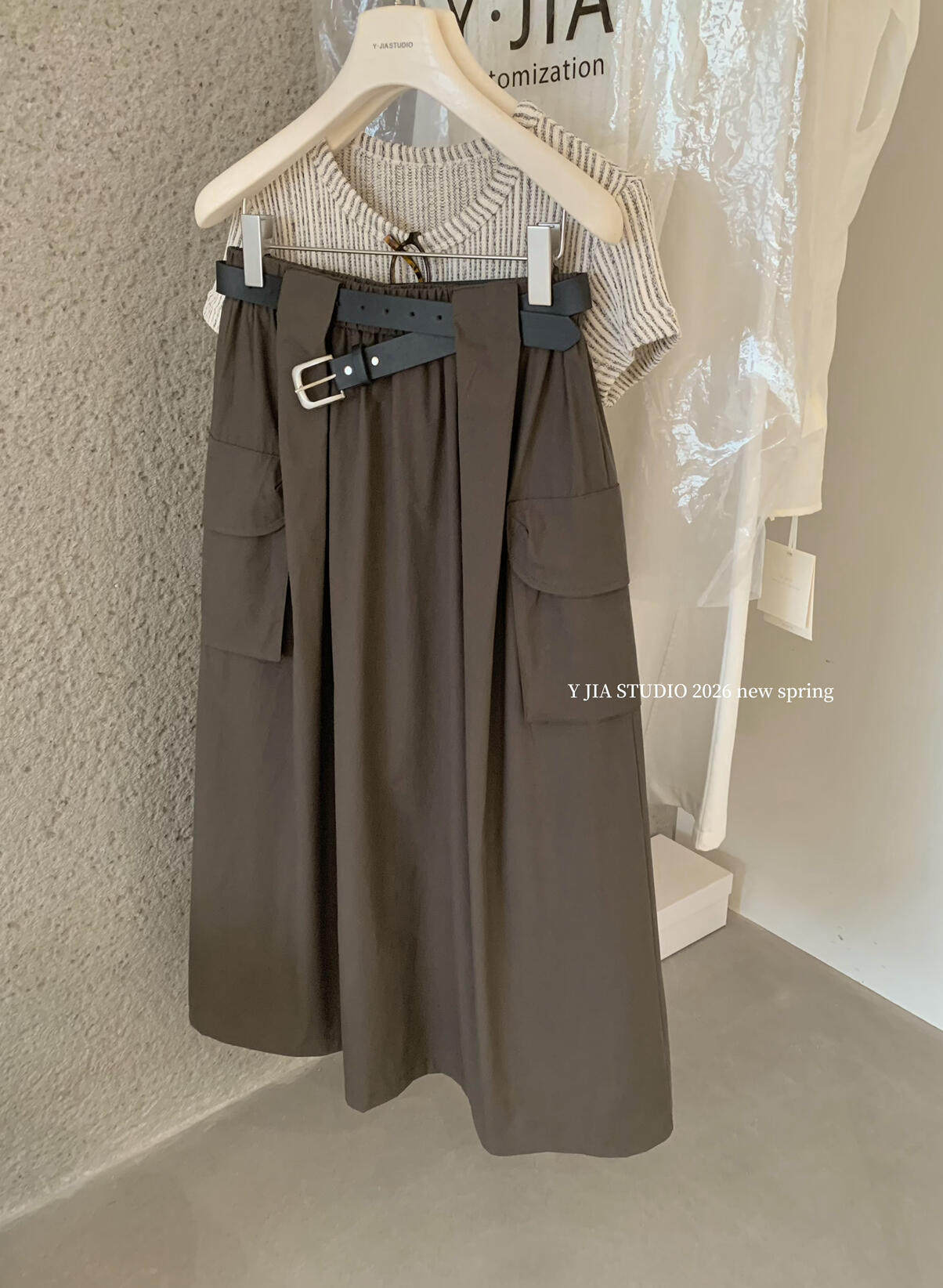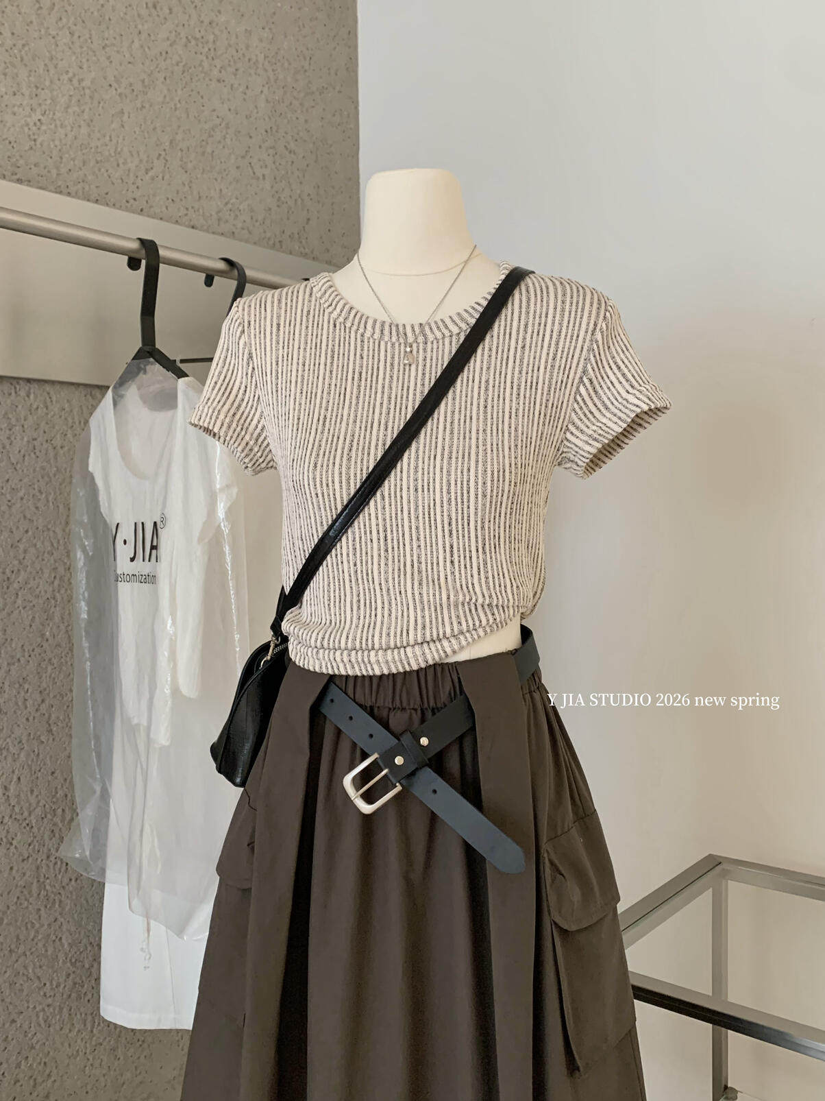 Y.JIA Yijia-облегающая футболка + костюм с рабочей юбкой с карманом и эластичной резинкой на талии (с поясом) Y26-5576