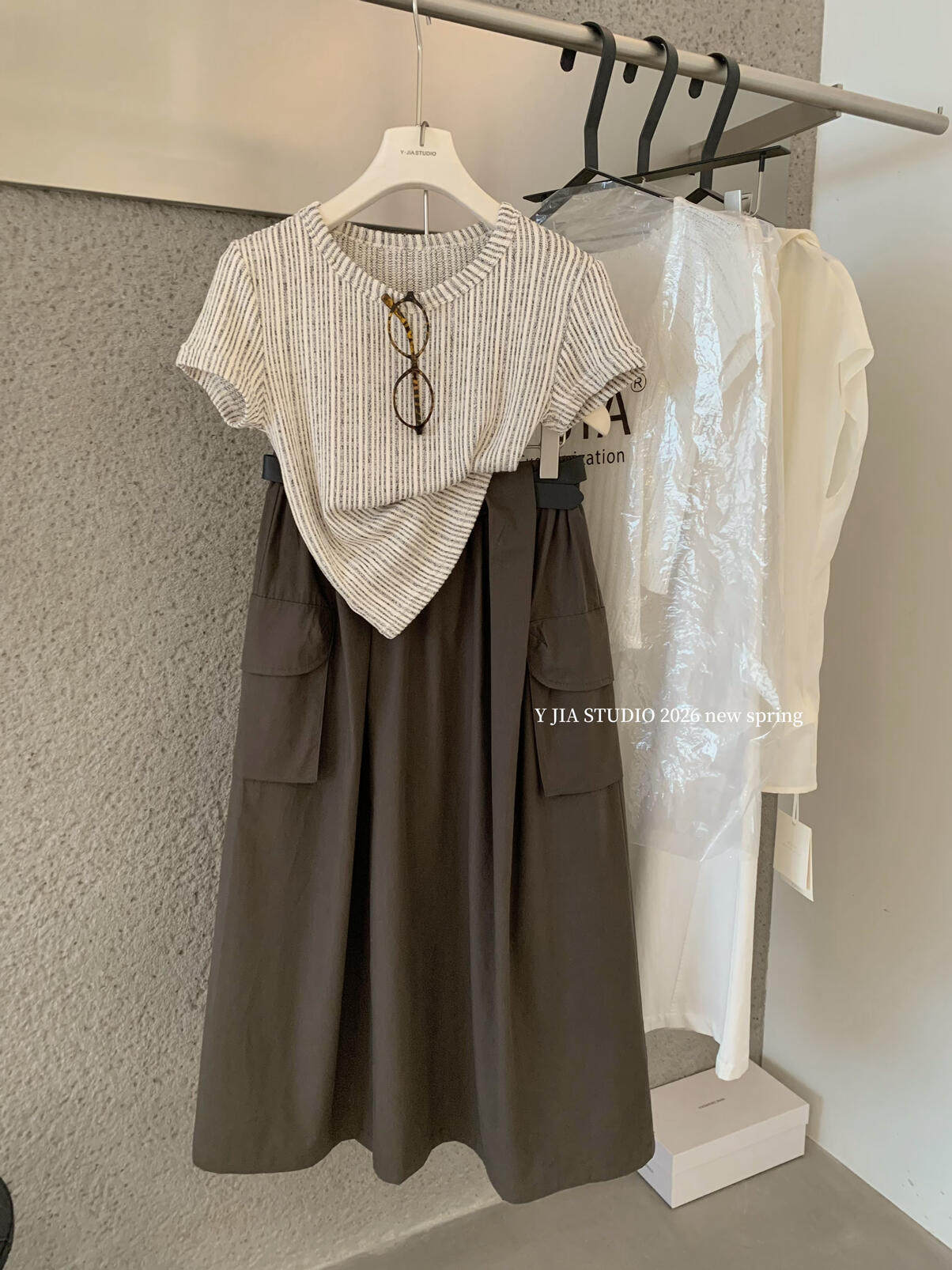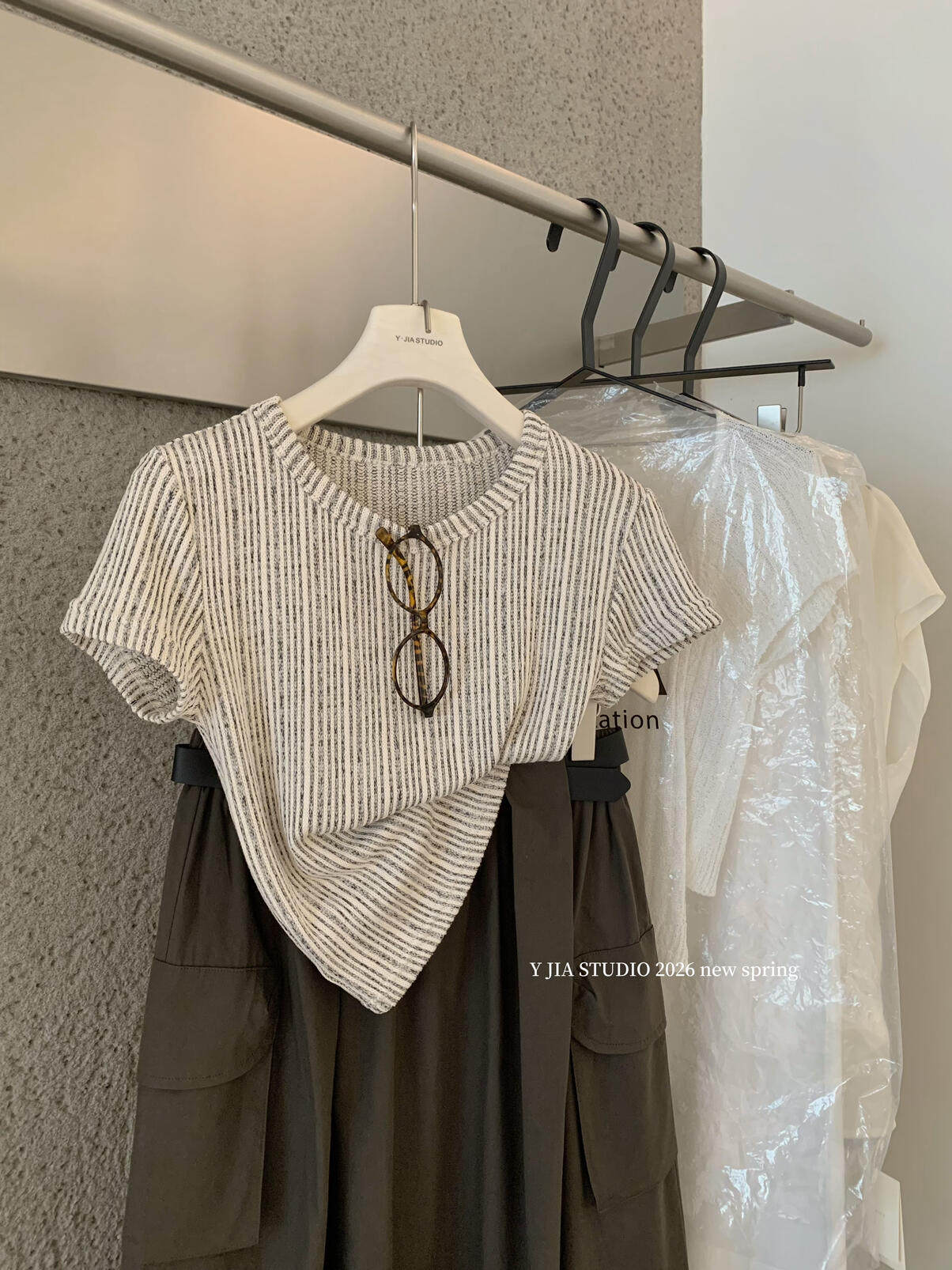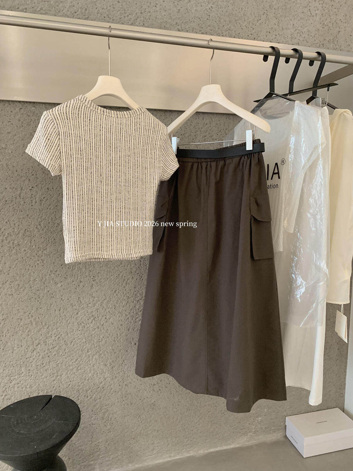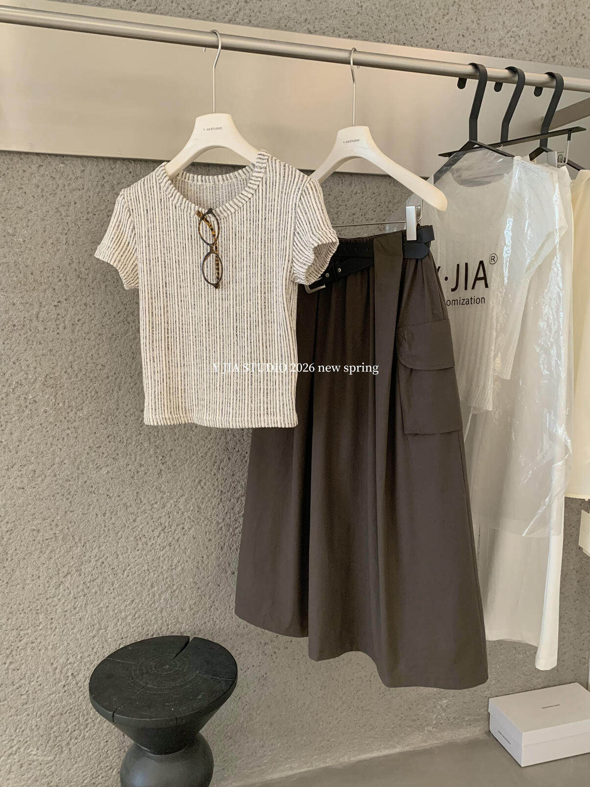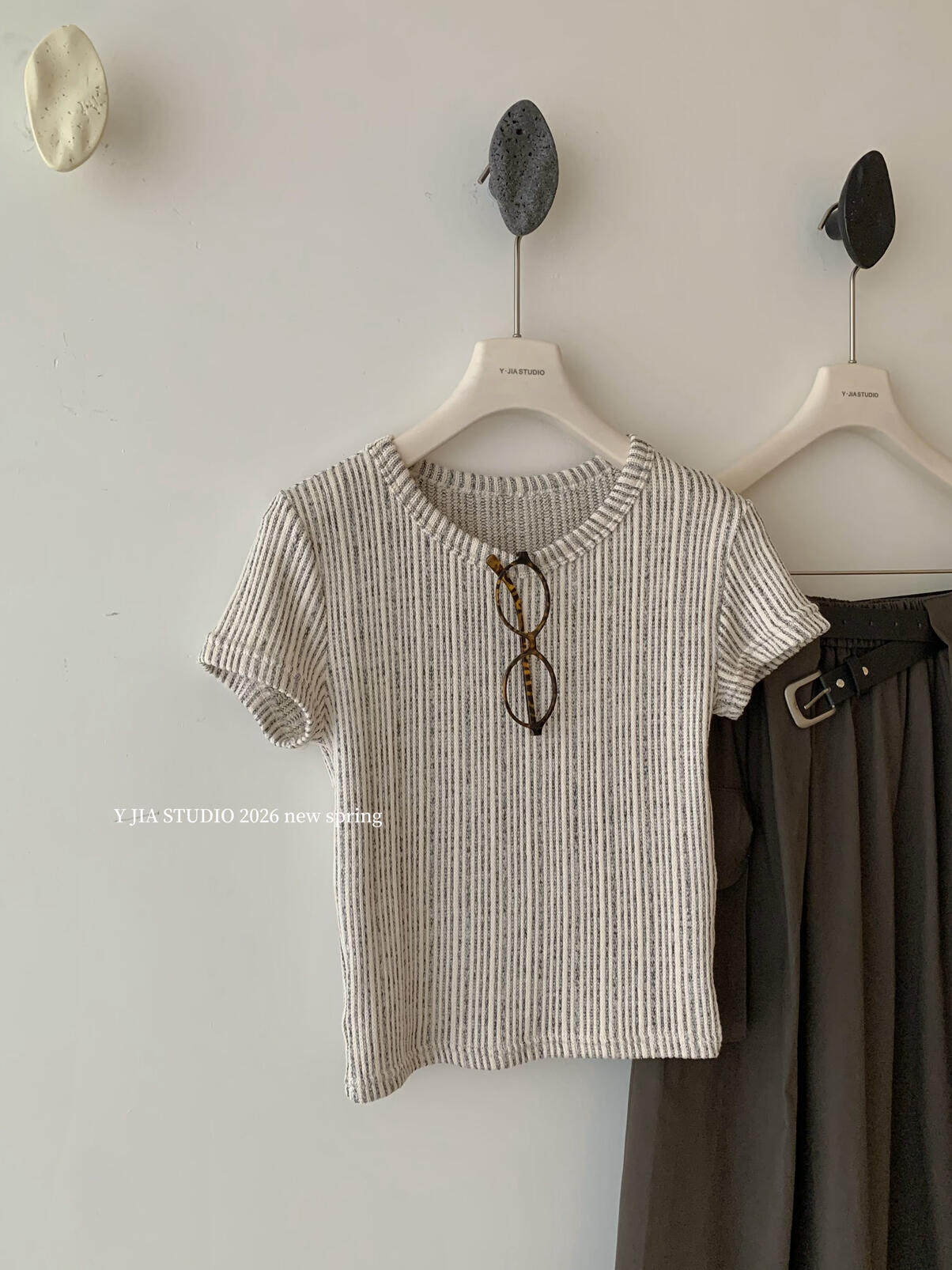 Y.JIA Yijia-облегающая футболка + костюм с рабочей юбкой с карманом и эластичной резинкой на талии (с поясом) Y26-5576