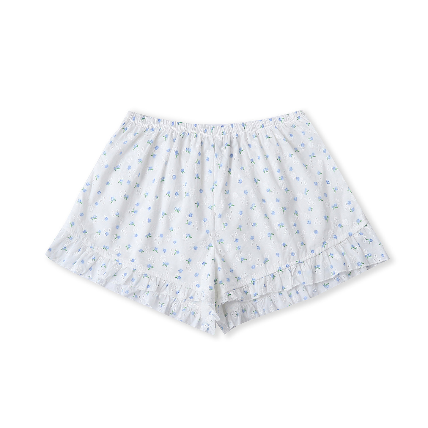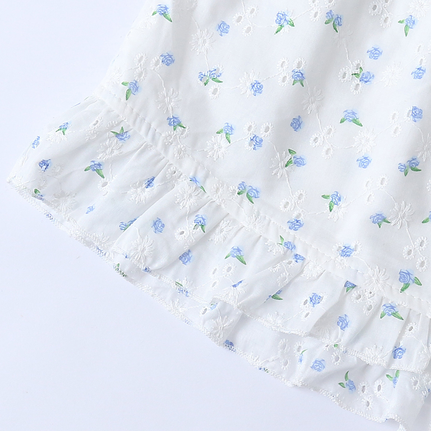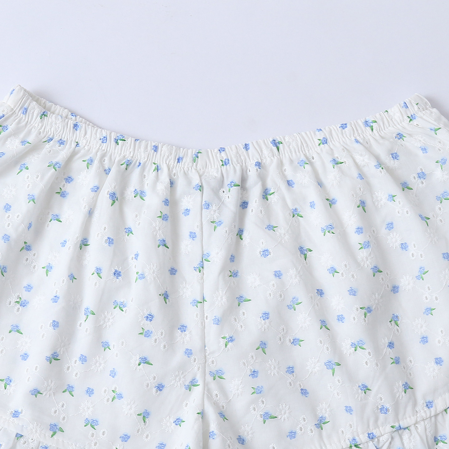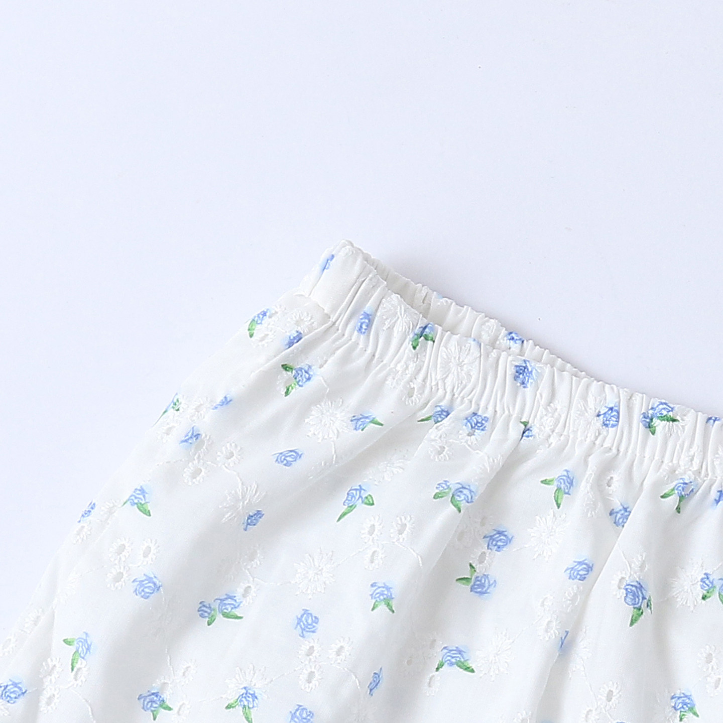 Детские детали: короткий фасон из хлопка, технология полой вышивки, широкие штанины.