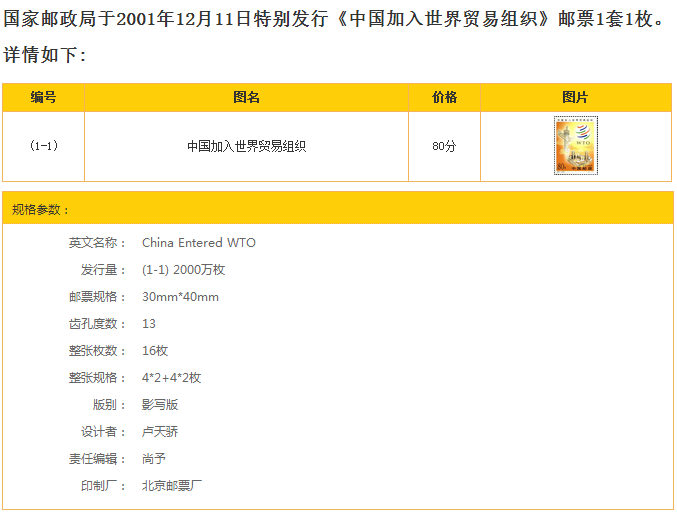 [Bole Post News Agency] 2001 Special 3 China присоединился к Мемориальной марки Всемирной торговой организации New China Mamp