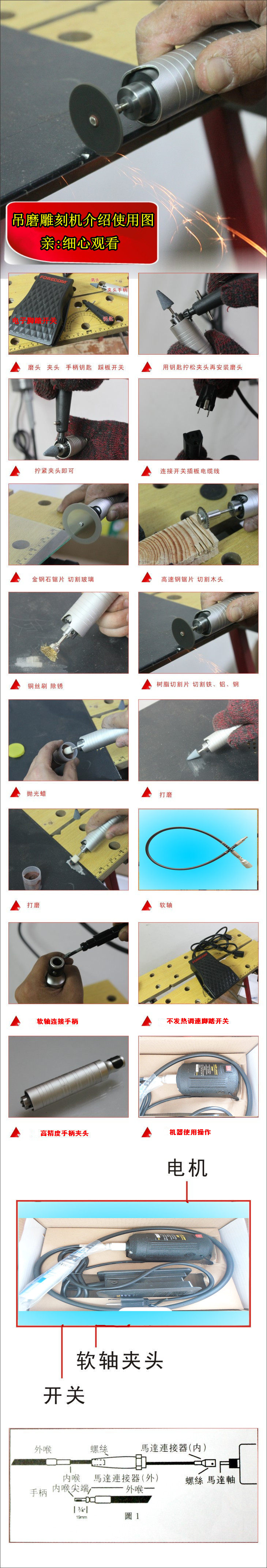 Детали: импортированные внутренние движения двигателя (примечание: оболочка является положительной меткой).Эта машина обладает большой мощностью, сильной мощностью, беспрепятственной трансмиссией, быстрой скоростью и свободным управлением, а не на тепло, выживающей электронные педали, под электронной платой есть винт круизной скорости, который можно зафиксировать, можно носить во влажной воде, ручка удобно, некоторые точные, немного точные, немного точные. Независимо от того, используется ли мастерская мастерская или играет дома, это первый выбор. Он подходит для каменной резьбы, нефритовой резьбы, резьбы по дереву, резьбы по кости, зуба Резьба, металлическая резьба, ремонт керамики, стекло, кристалл, драгоценные камни и т. Д. Она даже используется в качестве ногтей, стоматологических инструментов, инструментов для смешивания, инструментов для изготовления моделей и т. Д., И она широко используется и без использования.