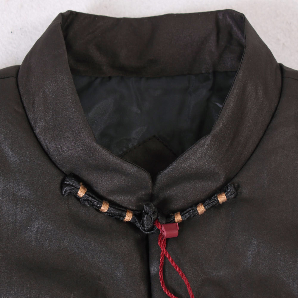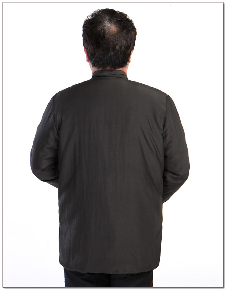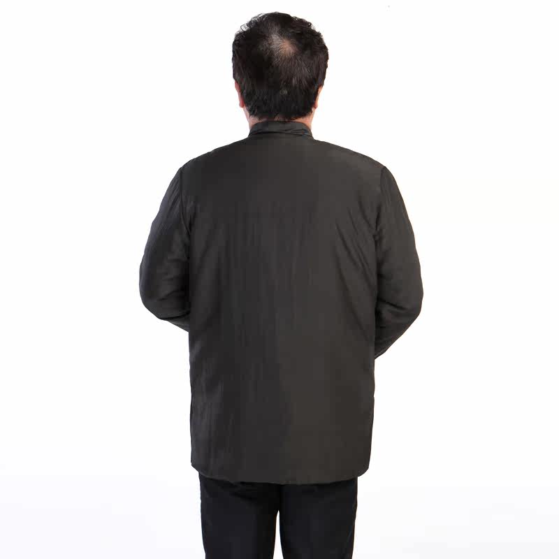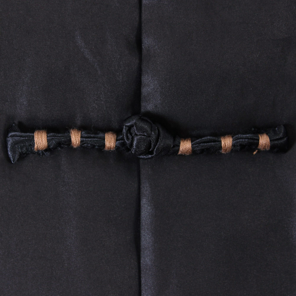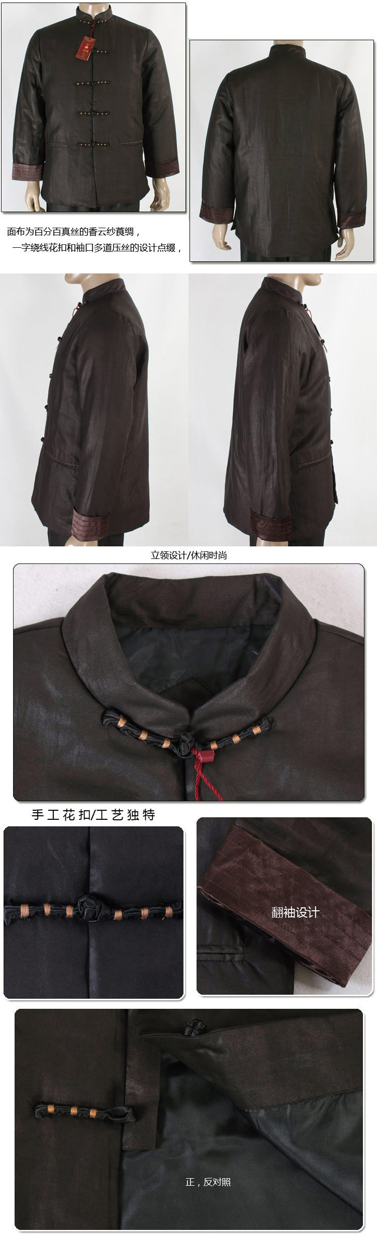 [中式服装款,面布为百分百真丝的香云纱莨绸,黑色,典型的中式服装/唐装款,一字绕线花扣和袖口多道压丝的设计点缀,让衣服充满了灵气,增添了休闲的味道]