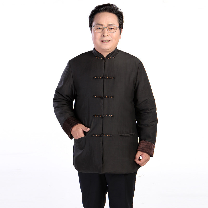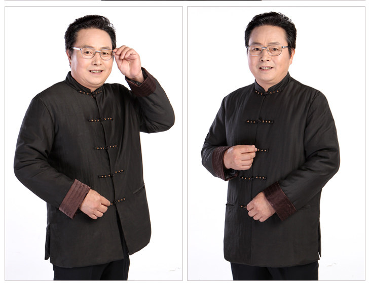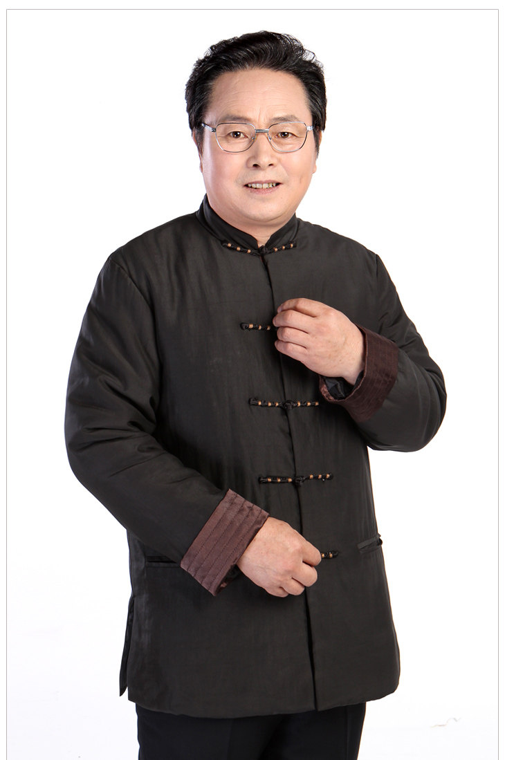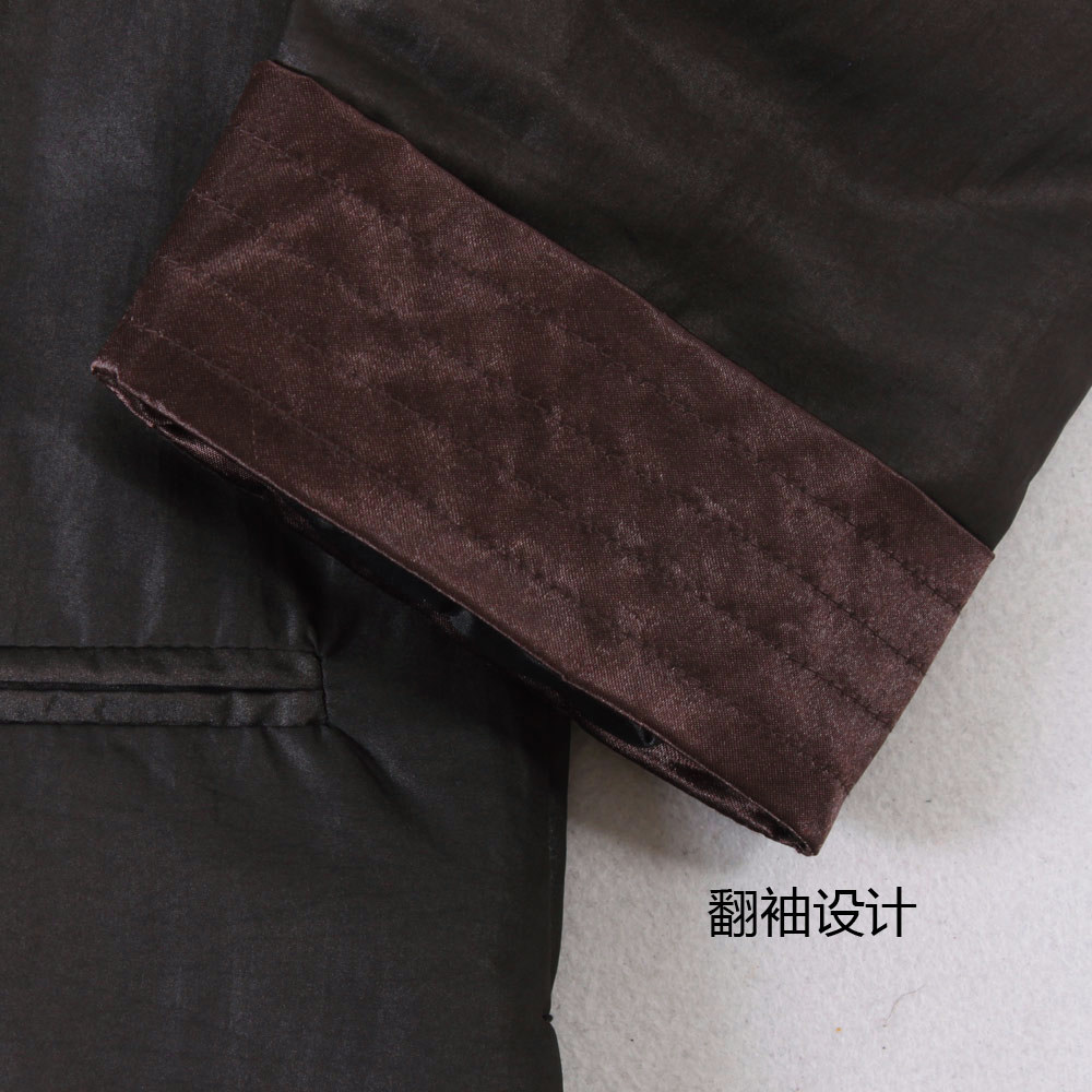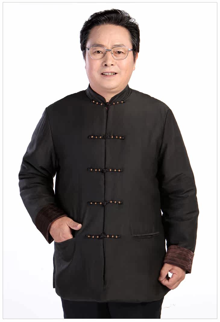[中式服装款,面布为百分百真丝的香云纱莨绸,黑色,典型的中式服装/唐装款,一字绕线花扣和袖口多道压丝的设计点缀,让衣服充满了灵气,增添了休闲的味道]