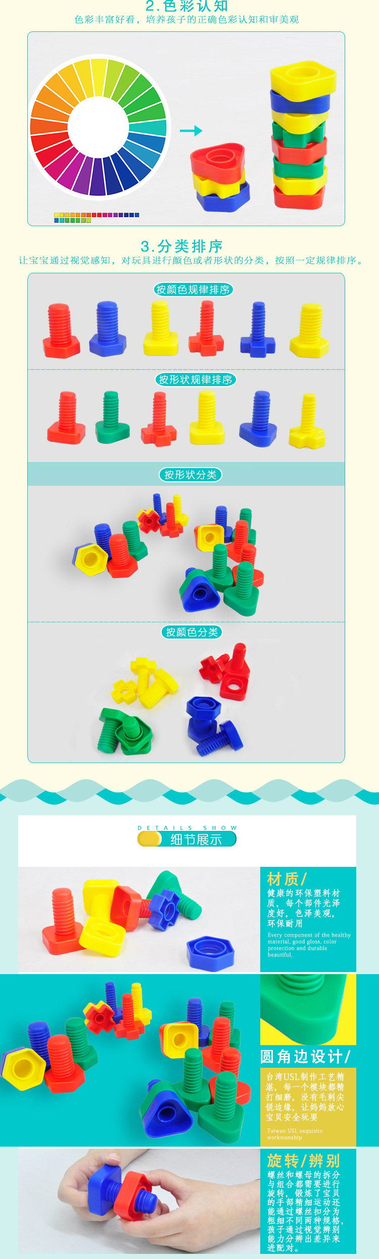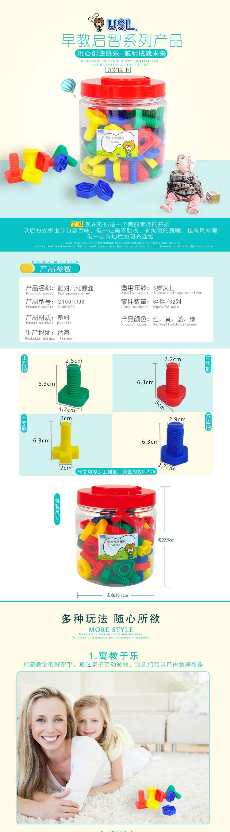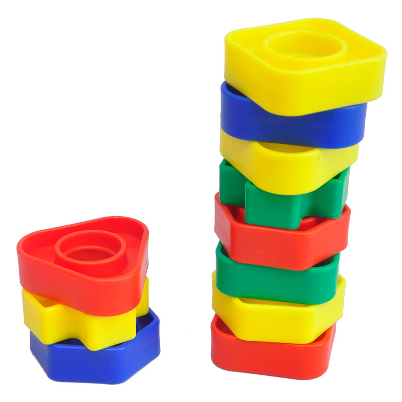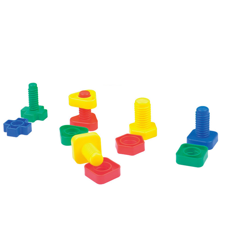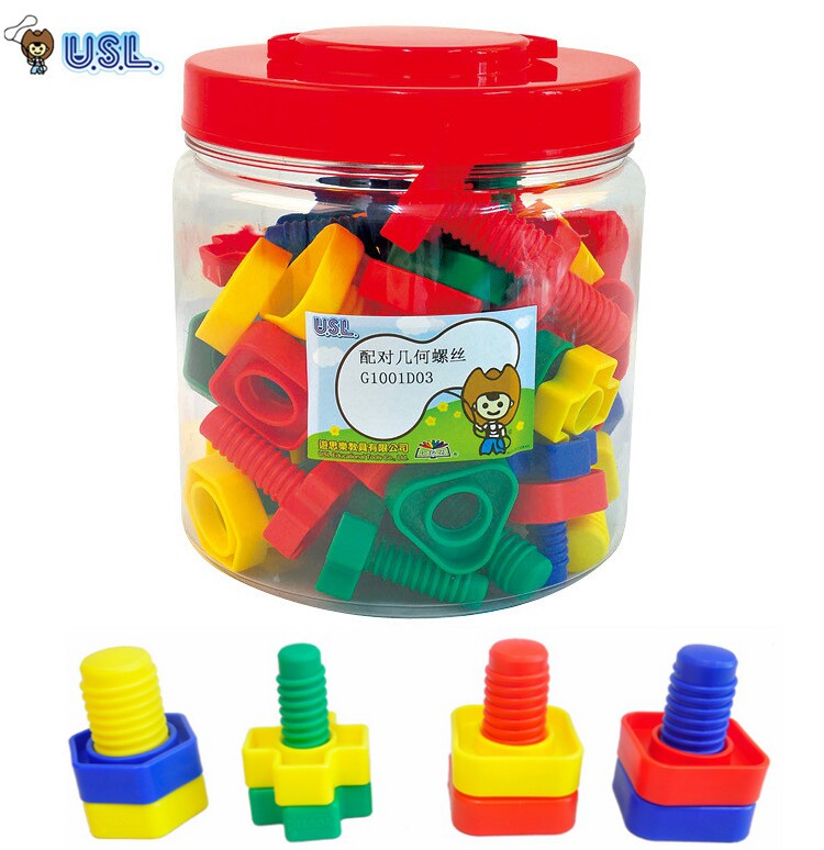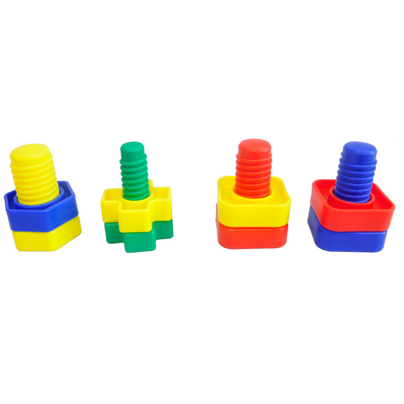 Примечание. 64 штуки (включая 4 цвета, 4 формы и 4 различных толщины винтов и гайков), которые можно использовать для понимания цвета, формы, толщины, классификации практики, сочетания и винтовых методов, а также способствовать наблюдению, координационной способности рук и развития небольших групп мышц.