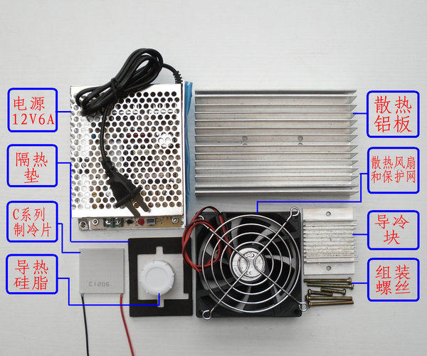 2. Подготовьте все необходимое, включая (чип охлаждения серии C: в качестве примера возьмите C1206, блок питания, термопасту, теплоизоляционную подкладку и этот комплект радиатора)