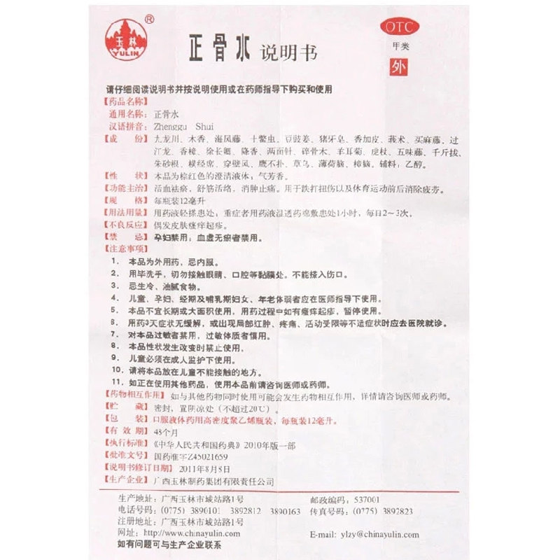 玉林 Положительная костная вода 12 мл кровообращения кровообращения и стазиса, стазиса, сухожилий, отеков, облегчения боли и облегчения боли и облегчения, Гуанси Юлин
