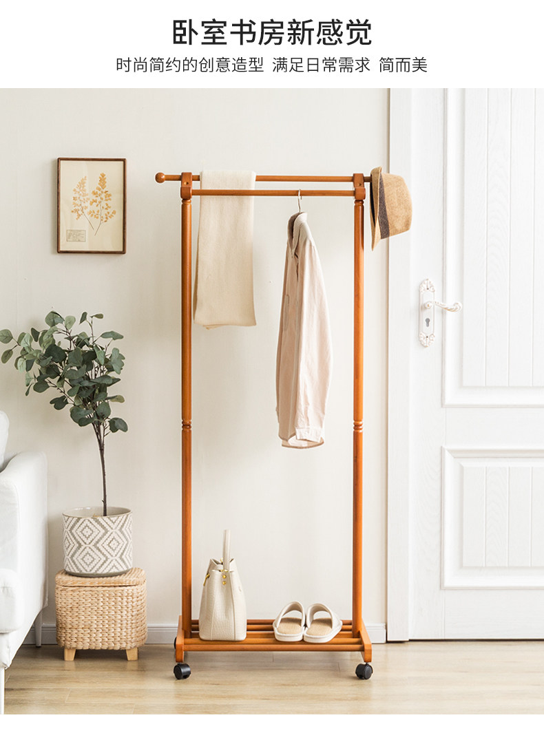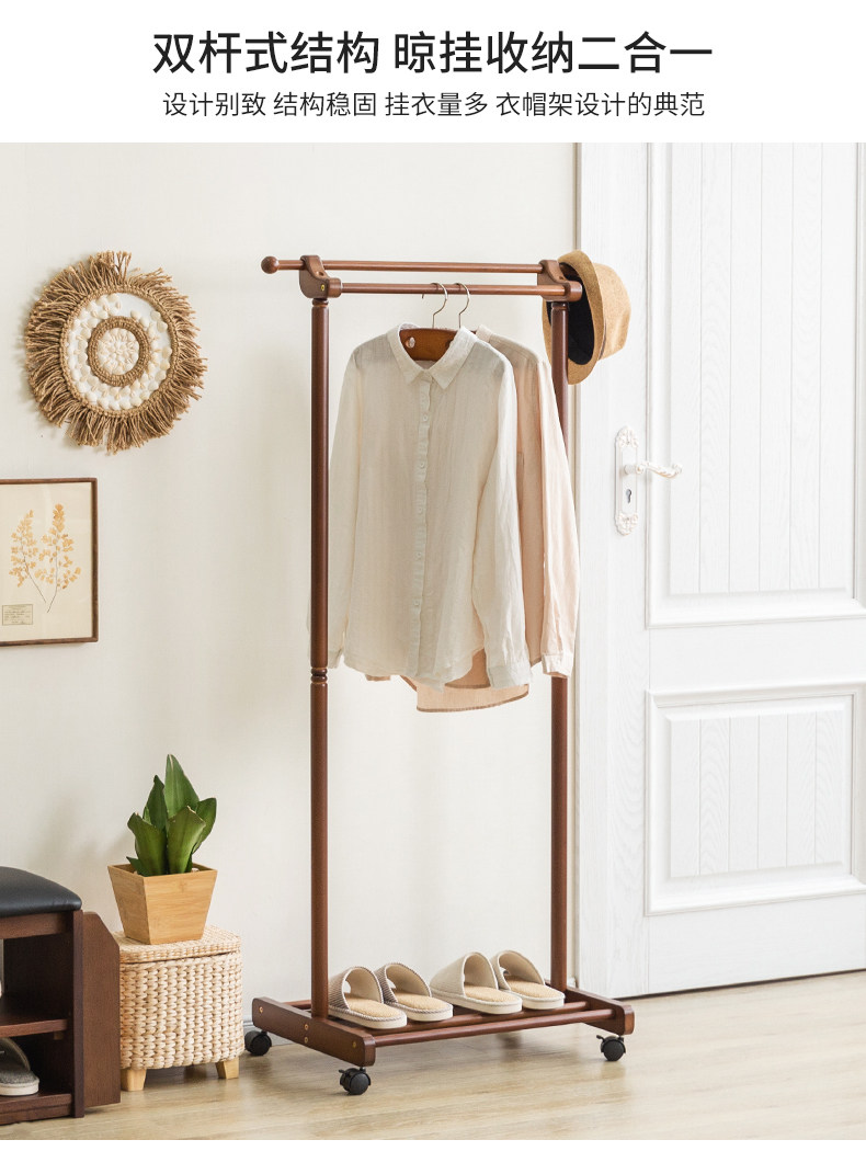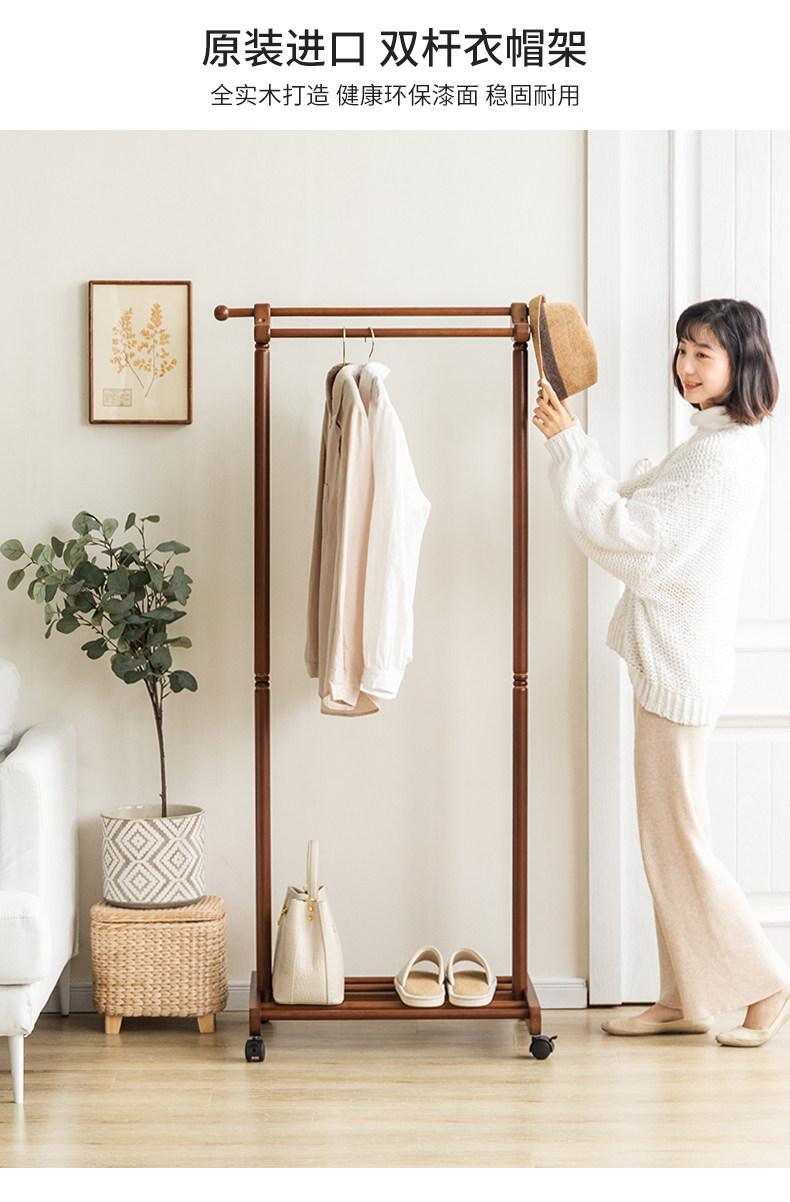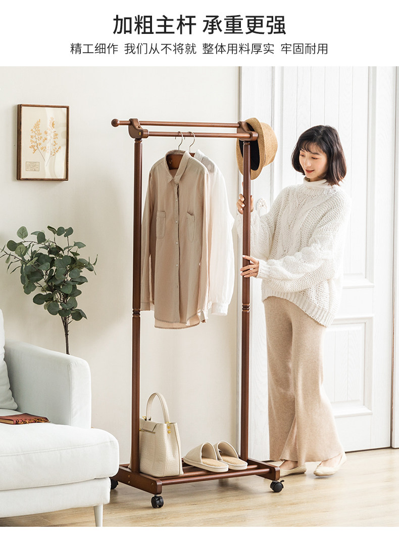 Сплошной древесиной двойной пелот для стойки на пол -к гостиной -комнатной комнате, подвесная вешалка Простые и современные домашние стойки для одежды могут двигаться