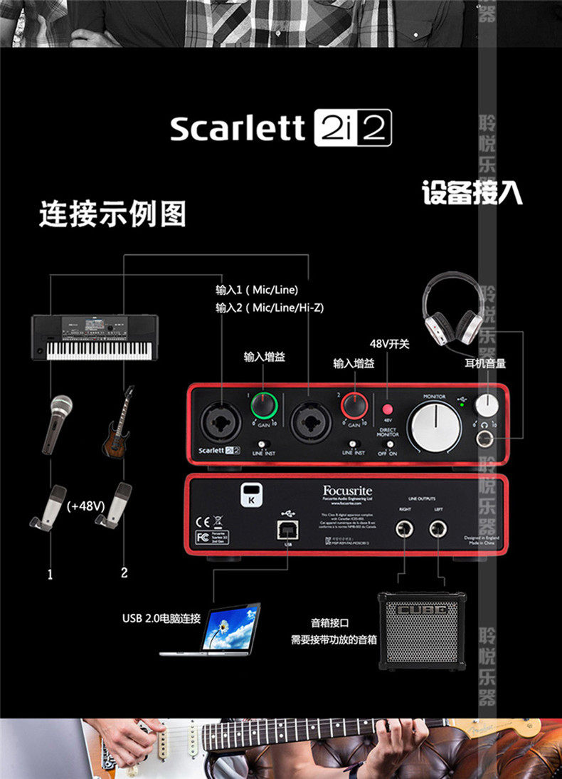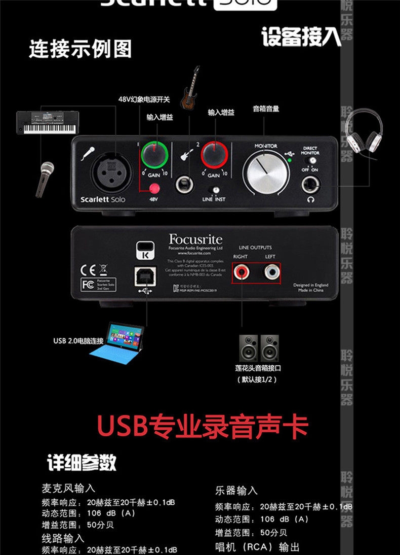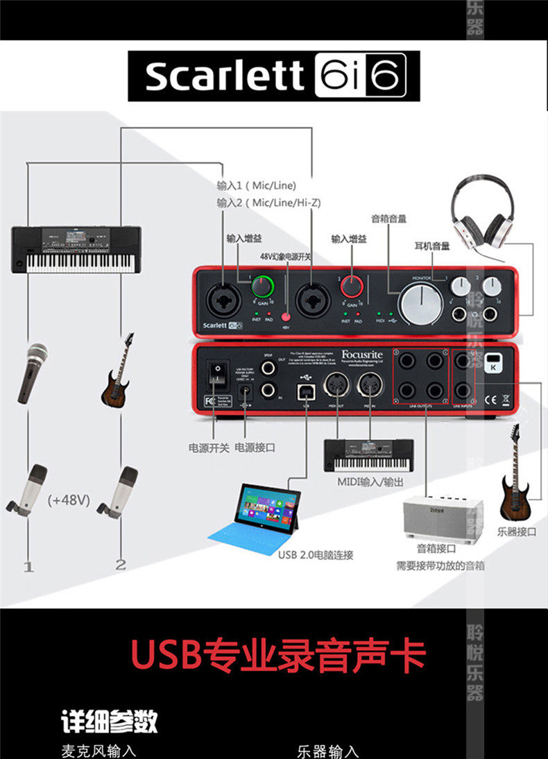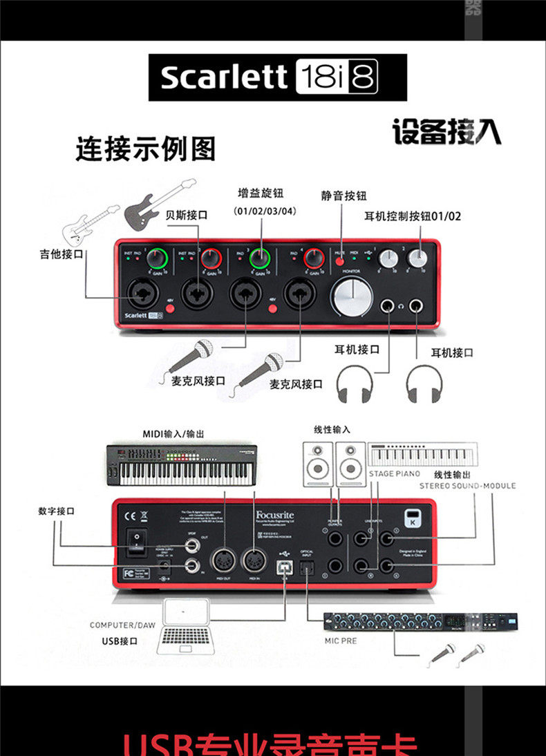 Focusrite Scarlett Solo/2i2/2i4/6i6/18i20 Звуковая звуковая карта Аудио -интерфейс звуковой карты