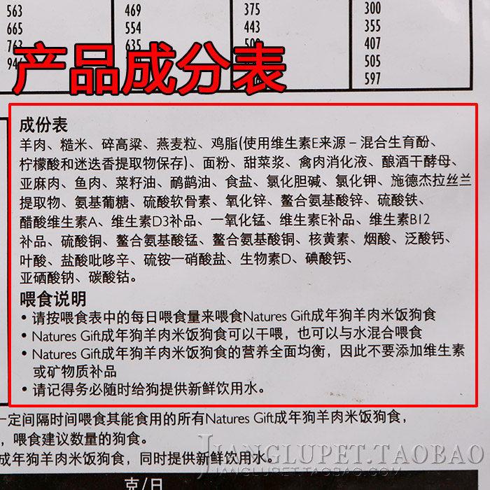 | | Ягненка, коричневый рис, сломанный сорго, овсянка, куриный жир (используйте витамин Е, смешанную из феноловой лимонной кислоты и экстракт розмарина), муку, говядина, пищеварительный раствор птицы, сушеные пивоваренные дрожжи, льня, рыбное мясо, рыбное мясо, рыбное мясо, Рапсовое масло, хлорид, хлорид хлорида, хлорид калия, экстракт Schndera Silan, аминокислотный глюкоза, хондроза сульфат, оксид цинка, аминокислота цинка, сульфат железа, ацетатный витамин А, витамин D3 D3 Дополнительный, ангаганский диоксид, витамин E, витамин B12, сульфат меди, аминокислота марганца, нуклеиновая кислота, никотиновая кислота, кальциевый пантотт, фолиевая кислота, никотинатный пирин, тиамин-нитрат кальций, нитрит натрия, карбонат кобальта. | |