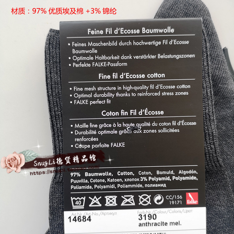 Германия импортировала Falke Firenze97%египетского хлопка Тонкий пот -Абсорбент, Пот -Абсорбент, Вентиляция, Деловые мужские носки короткие носки