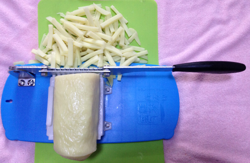 [2.我们这款年糕刀是切丝切片两用][的,两个刀片材料是合金钢,刀架铁涂了层防锈漆]