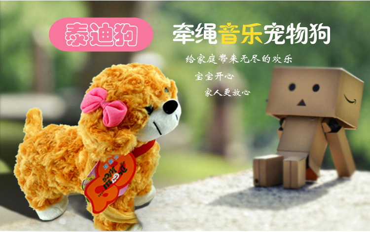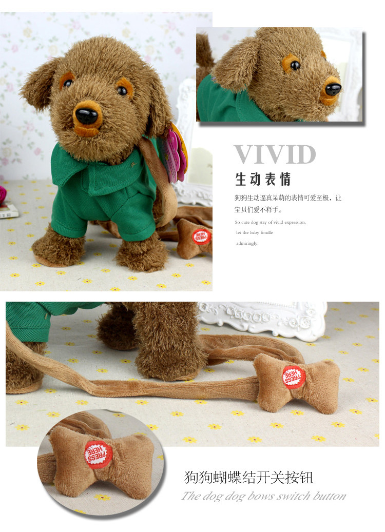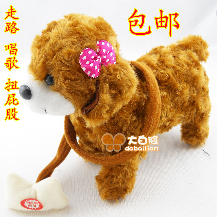 Электрический щенок-симулятор, который умеет ходить и вертеть задницей. Какая милая маленькая собачка. После нажатия красной кнопки на конце поводка поясница и лапы собаки начнут ритмично двигаться под красивую музыку, она будет крутить ягодицами, ходить и одновременно петь.