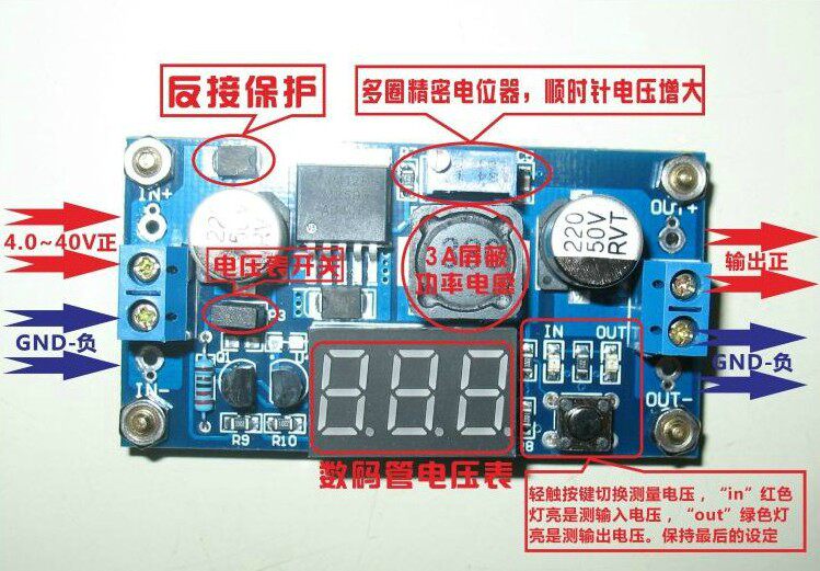 ●Принесение дисплея с метром напряжения, Ошибка напряжения&Plusmn; 0,1 В, диапазон от 0 до 40 В.(Примечание: входное напряжение ниже 4 В, а измеритель напряжения пластины не работает и не отображается)