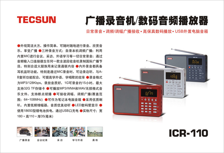 TECSUN ICR-110Это еще один карманный рекордер/цифровой аудиоплеер с функцией записи.Есть три метода записи, которые могут быть записаны на этой машине. Вы можете использовать встроенный микрофон для ежедневной работы, такой как запись конференции, интервью и изучение иностранных языков. Вы можете ввести радиопрограмму через интерфейс ввода линии. Функция прослушивания позволяет записывать, наслаждаться музыкой и наслаждаться трансляциями в любое время и в любом местеСущность