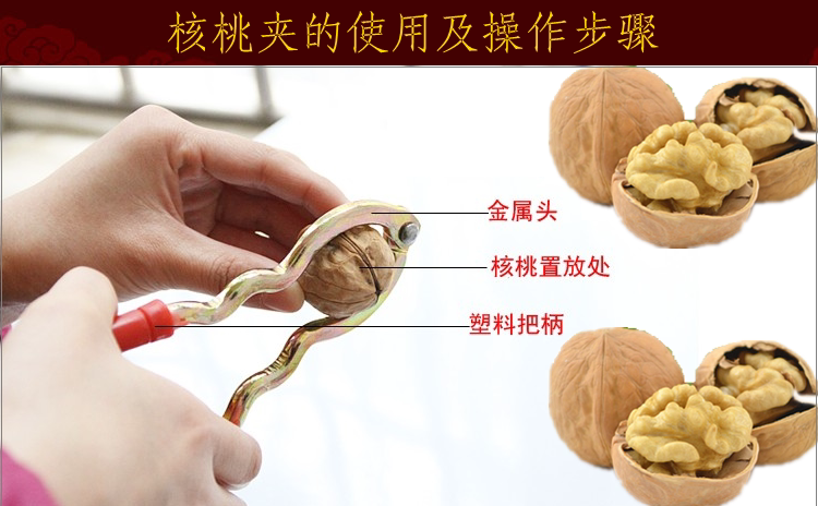 Как использовать ореховые клипы:Положите грецкий орех на зажим с зубами, дайте зажиму укусить часть клипа, а когда щепотка ущипнута, грецкий орех открывается.
