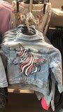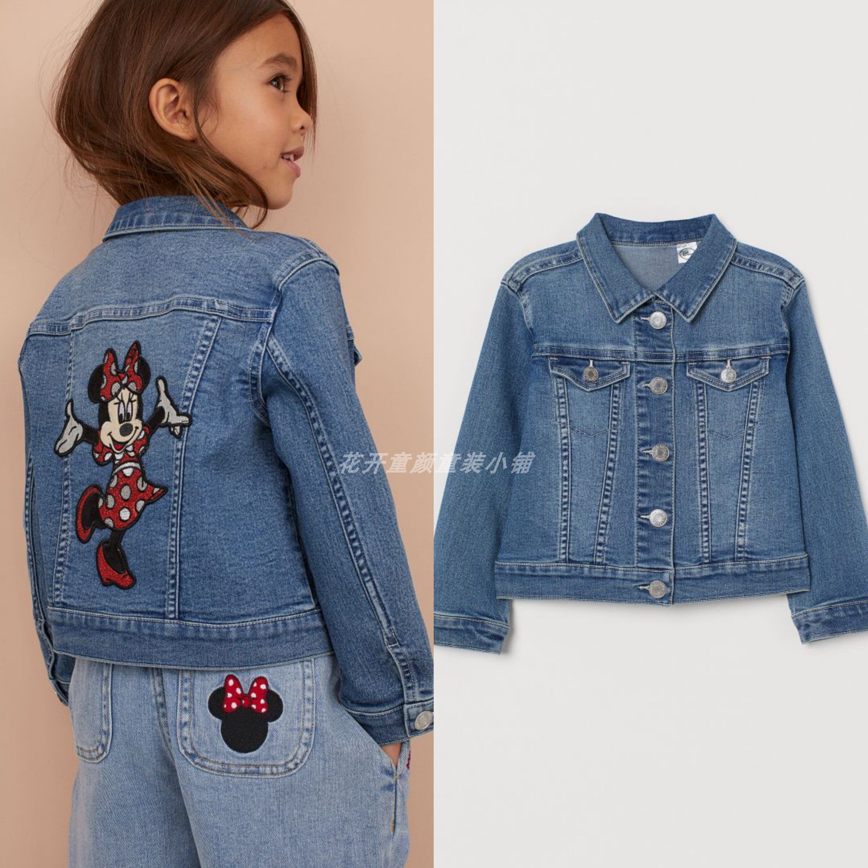 Есть промытые водой джинсовые куртки, передняя часть украшена блестками, а поддельная сумка для груди прикреплена.