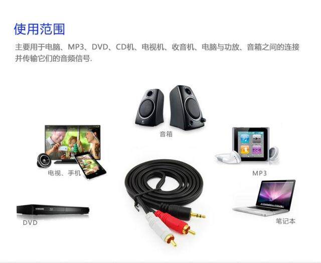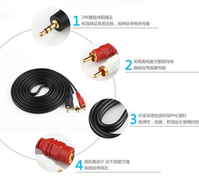 этотОдин пункт и два аудиокабелиИспользуйте 24 -километровое золото, защита от экранирования.Создан с помощью анаэробной меди, сухойСильное беспокойство.Продукты подходят для компьютера, MP3, DVD, телевизора, радиоПотеряет свои аудиосигналы.Хорошая анти -интерференция, и сигнал передачи уменьшается.