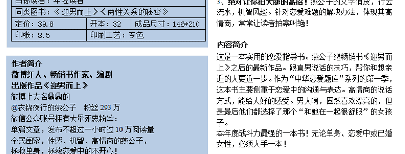 Это практическое руководство по любви.Последняя работа г-на Яна после его первой книги «Приветствие человека».Советы по общению с гетеросексуальными мужчинами помогут вам сблизиться с человеком, с которым вы хотите сблизиться.как“Китайская база вопросов о любви”Эта книга, второй сезон сериала, посвящена общению и выражению любви.Способ говорить с высоким эмоциональным интеллектом может заставить людей чувствовать себя хорошо.Мужчины, конечно, любят красивых, но в итоге все выбирают именно такую.“Очень удобно быть с ней”Девушки.