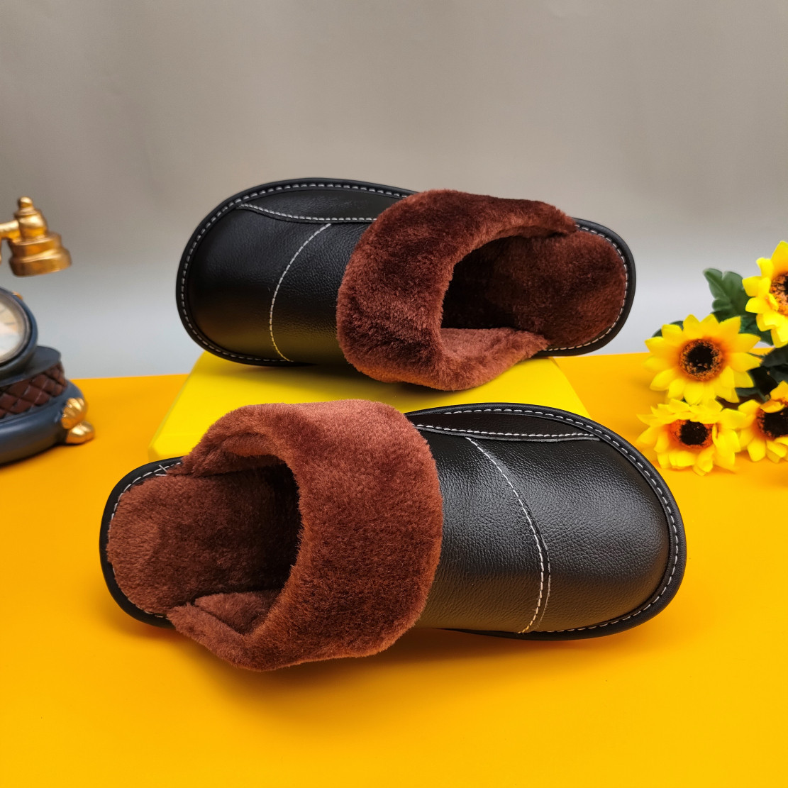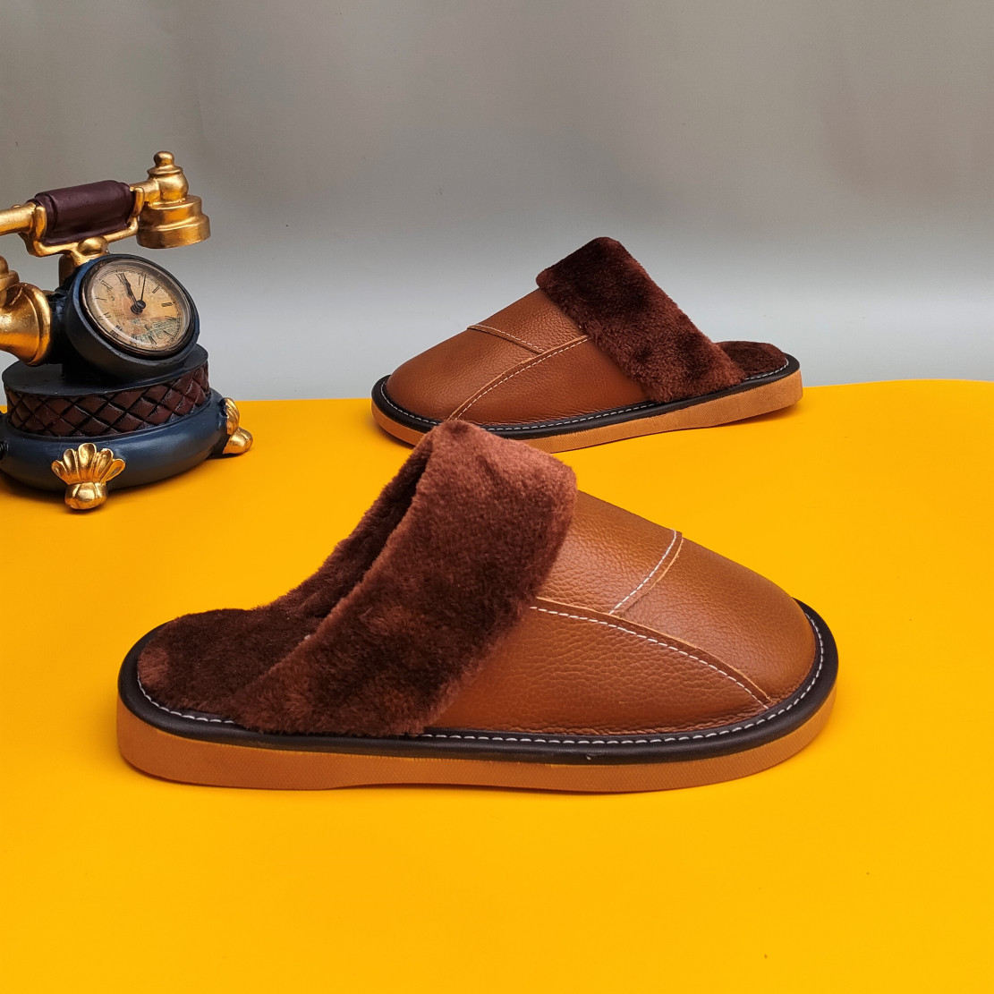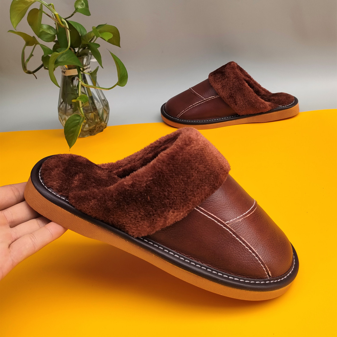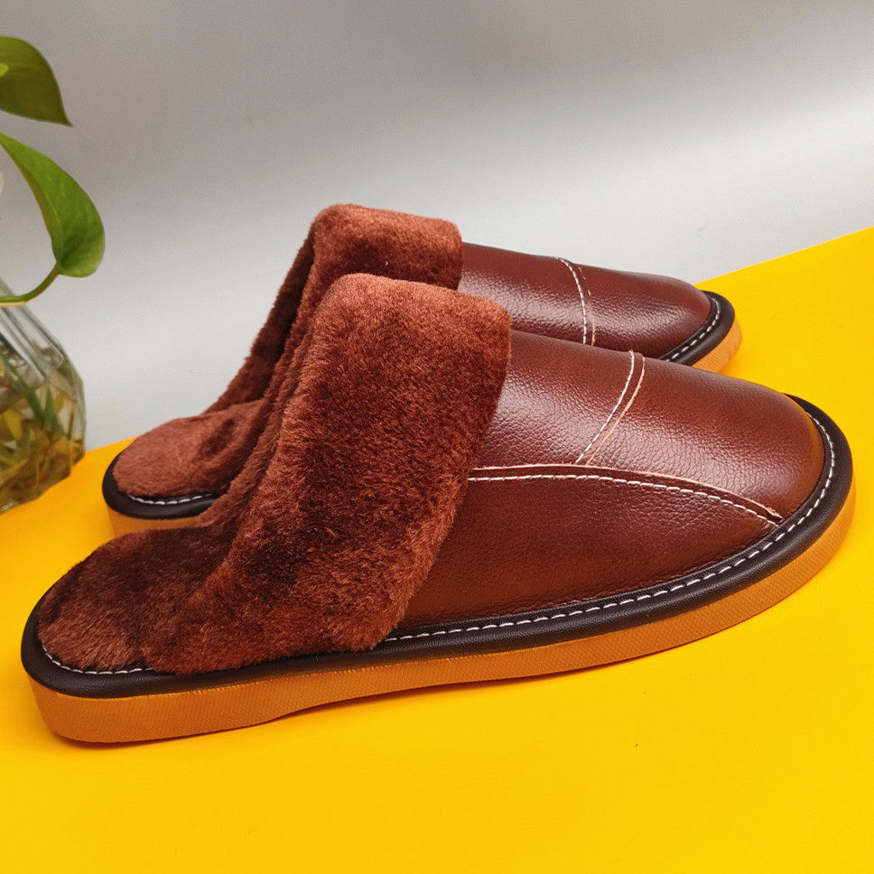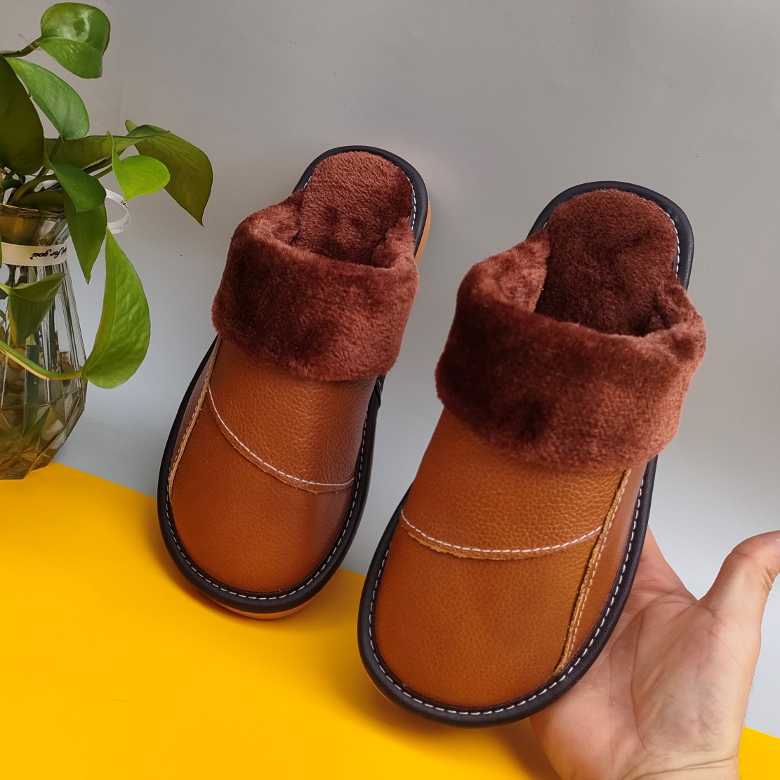 Мужские домашние женские тапочки из натуральной воловьей кожи, кожаные водонепроницаемые осенне-зимние нескользящие хлопковые туфли на толстой подошве с мехом