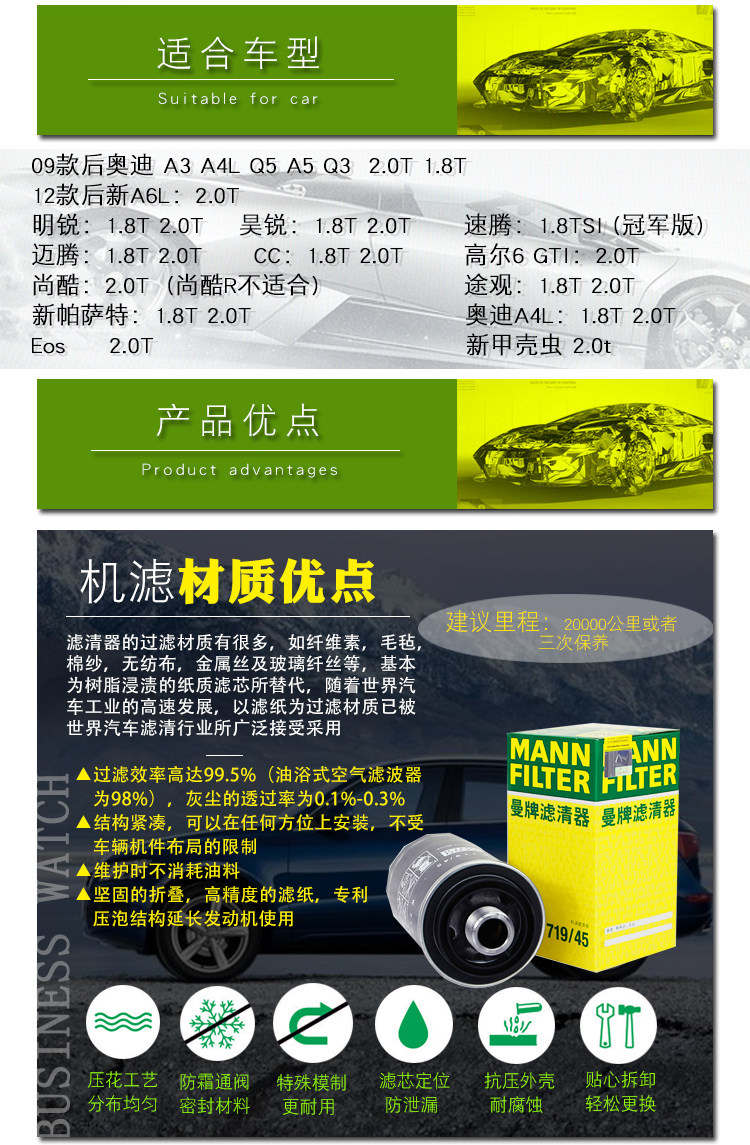 Применимо к A4L Q3 Q5 A5 New A6L TT Second -Generation EA888 машинный фильтр Manpan W719/45M с M