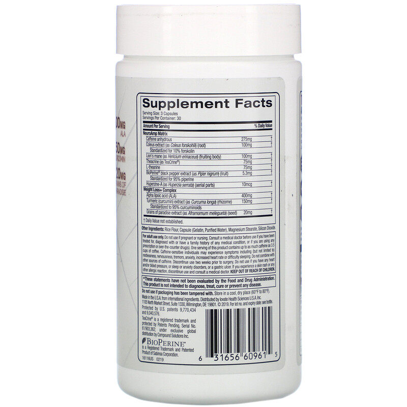 Рисовая мука, капсулы (желатин, чистая вода), стеарат магния, кремнезем.Порции: 3 капсулы Количество порций: 30 контента на порцию Ежедневный процент потребления матрицы нейросла. 275 мг †Форсколиновый экстракт (корень) нормализован до 10% форсколина 100 мг †Обезьяна Erectus (фруктовая сущность) 100 мг †Теофиллин (чайкрин)®Полем 75 мг †L-Lydicine 75 мг † BioPerine®Экстракт черного перца (фрукты) стандартизирован до 95% саженцев 5,3 мг †Змея стоп кипариса (над землей) 10 микрограммов †Слим + комплексαЛипоевая кислота (ALA) 400 мг †Экстракт куркумы (куркума) стандартизирован до 95% куркумин 150 мг †Экстракт раяного перца (семя) 20 граммов † †Процентный процент ежедневного потребления не определяется.